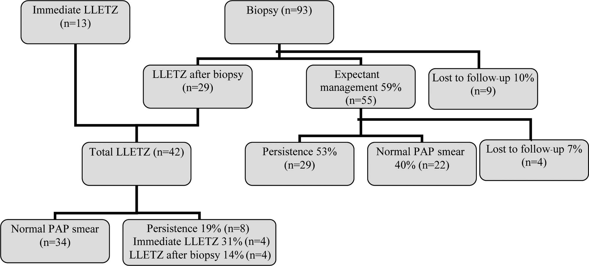 Management of CIN2 lesions. Of the patients who had never had prior cervical interventions, a diagnostic biopsy was performed on 93 patients and a LLETZ procedure was performed on 13 patients. After biopsy, expectant management was selected for 55 patients, and second-visit LLETZ procedures for 29 patients. The rate of persistent disease following expectant management was 53 versus 19% following treatment with LLETZ.