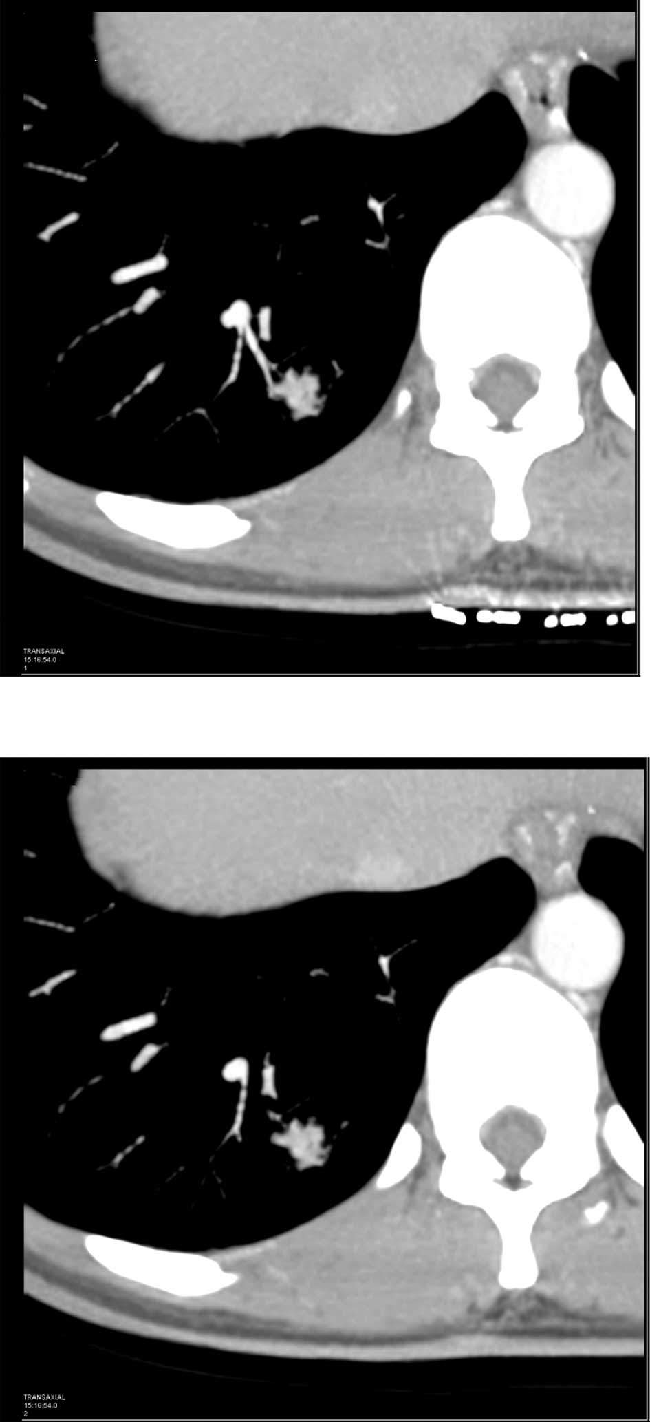 Komatsu T, Fukuse T, Wada H and Sakurai T: Pulmonary sclerosing hemangioma with pulmonary metastasis. Thorac Cardiovasc Surg. 54:348–349. 2006. View Article : Google Scholar : PubMed/NCBI