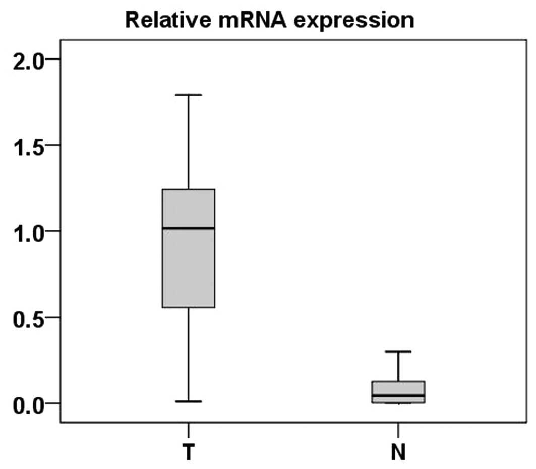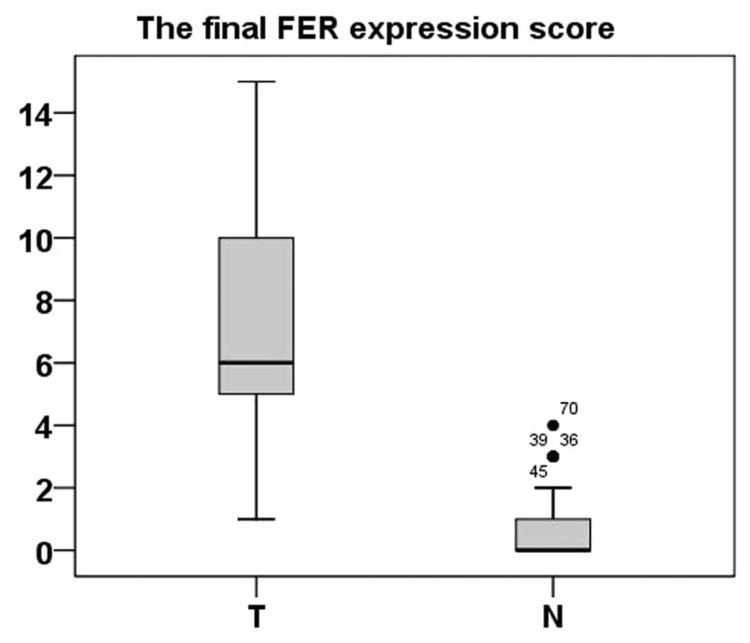Real-time PCR was performed to measure the expression of FER mRNA in 48 ccRCC tumor tissues and ADTs. Compared with normal tissues, 46 ccRCC tumor tissues exhibited significantly high expression of FER at the mRNA level (P<0.001, paired-sample t-test) (Fig. 1).
