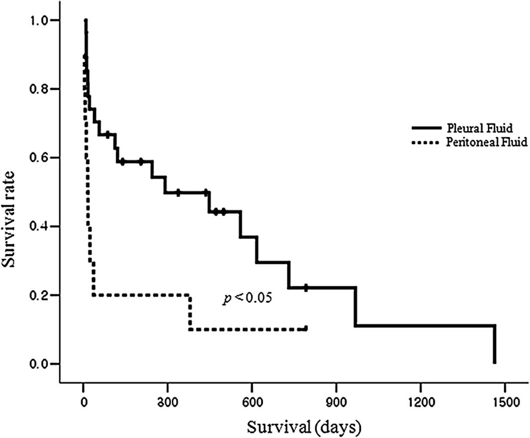 In the present study, we investigated the role of matrix metalloproteinase (MMP)-2 and -9 as novel biomarkers in the body fluid of patients with metastatic breast cancer. We measured the expression of MMPs in 37 samples of body fluid (10 peritoneal and 27 pleural fluids) from metastatic breast cancer patients between 2000 and 2009. Zymography and ELISA assays were used to determine the cut-off level and to quantify MMP expression from a positive control, HT-1080 conditioned media. MMP expression in patient samples was measured with ELISA and compared with other clinical parameters. Ascitic carcinoembryonic antigen (CEA) and pleural CEA were measured in patient samples with a chemiluminescent enzyme immunoassay. Body fluid cytology had a positivity of 45% (9/20) for pleural fluid and 28.6% (2/7) for ascites. However, MMP-2 had a positivity of 85.2% (23/27) in 27 pleural fluid samples and 100% (10/10) in ascitic fluid with cut-off levels of 8.6 and 0.14 ng/ml for MMP-2 and -9, respectively. When body fluid CEA and MMP-2 were combined, the positivity improved to 96% in pleural fluid and 100% in ascites. MMP-2 expression in body fluid did not show any significant differences, but MMP-9 expression was lower in ascites than in pleural fluids (p<0.005). Our results suggest that MMP-2 expression in body fluid be used as an additive diagnostic marker for metastatic breast cancer patients.