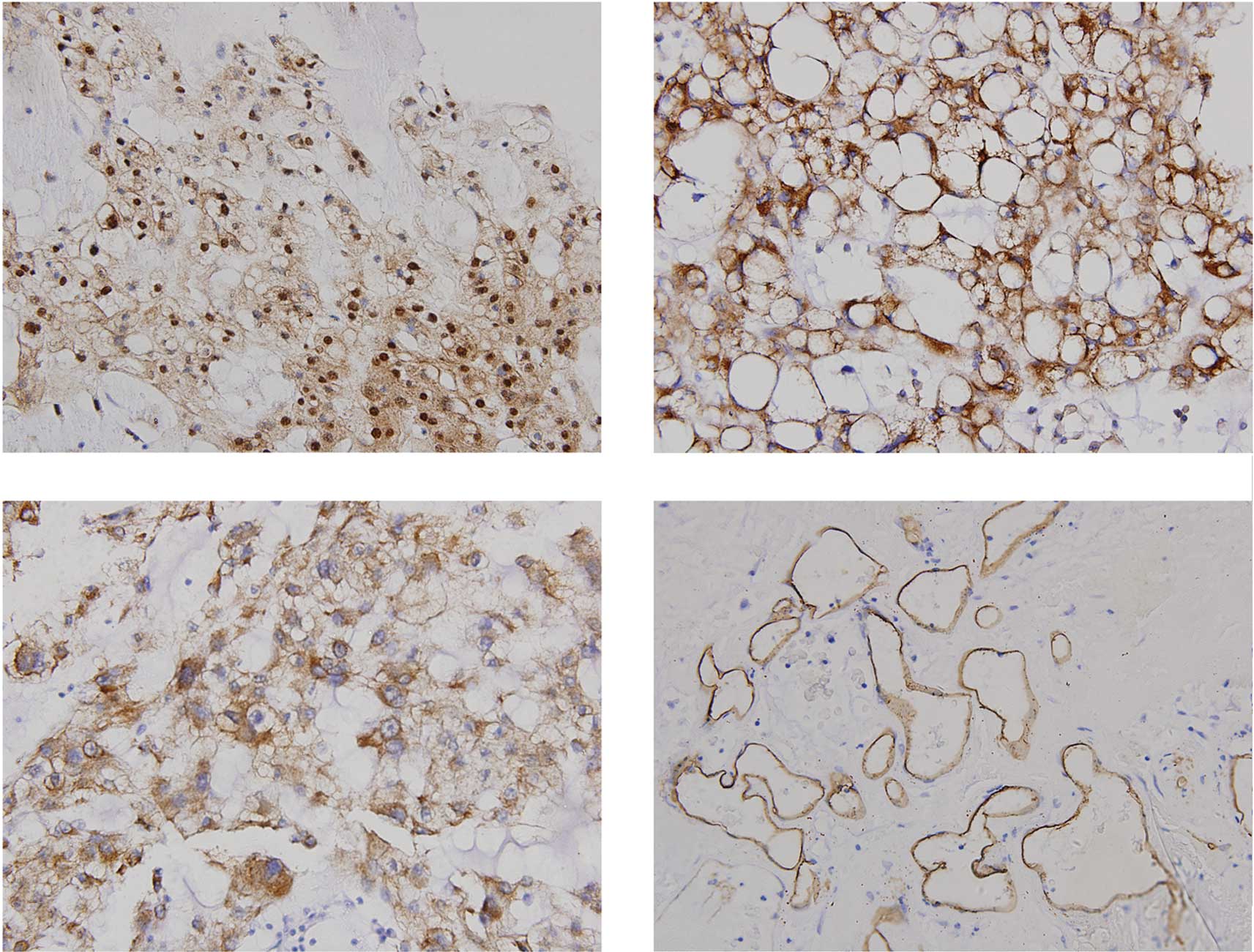 HIF-1α, VEGF and MMP-2 immunostaining was assessed and the samples were grouped into high-or low-grade categories. HIF-1α expression showed a nuclear and/or cytoplasmic staining pattern with diverse intensities (Fig. 1). Of the 35 chordomas, 26 (74.3%) exhibited strongly positive HIF-1α staining (score ++, +++ or ++++) and 9 (25.7%) showed weakly positive staining (score − or +). Immunohistochemical staining of VEGF and MMP-2 was observed predominantly in the cytoplasm of the tumor cells. Of the 35 chordoma cases, 25 (71.4%) exhibited high VEGF expression levels. MMP-2 expression was classified as high in 24 (68.6%) of the chordoma cases. The immunohistochemical staining of each protein and their correlation with patient age, gender, tumor size, local recurrence and distant metastases are shown in Table II. No correlation was found between any of the three factors and clinicopathological characteristics (patient age, gender, tumor size, local recurrence and distant metastases) for any patient (P>0.05).