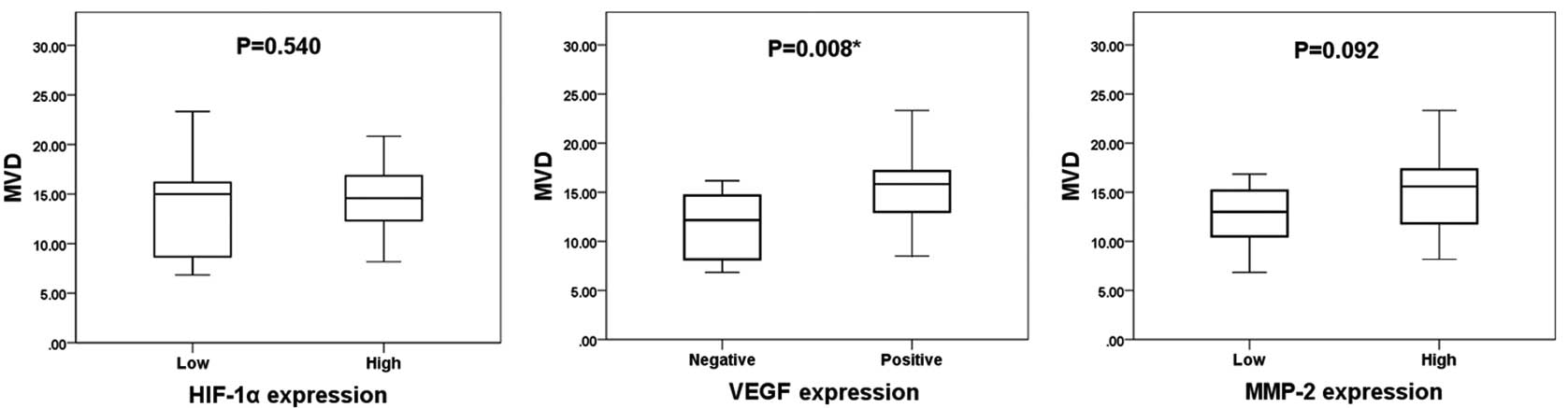 The mean MVD value was 14.2±4.0. The expression levels of HIF-1α, VEGF and MMP-2 compared with MVD are shown in Fig. 2. The mean MVD (in microvessels per field) in the high and low HIF-1α expression groups was 14.4±3.4 and 13.5±5.5, respectively. The mean MVD in the VEGF-positive and VEGF-negative groups was 15.3±3.7 and 11.5±3.6, respectively, and the mean MVD in the high and low MMP-2 expression groups was 14.9±4.0 and 12.6±3.6, respectively. VEGF expression was significantly associated with MVD (P=0.008), whereas the expression levels of HIF-1α and MMP-2 were not significantly associated with MVD, as determined by the Mann-Whitney U test (P=0.540 and P=0.092, respectively).