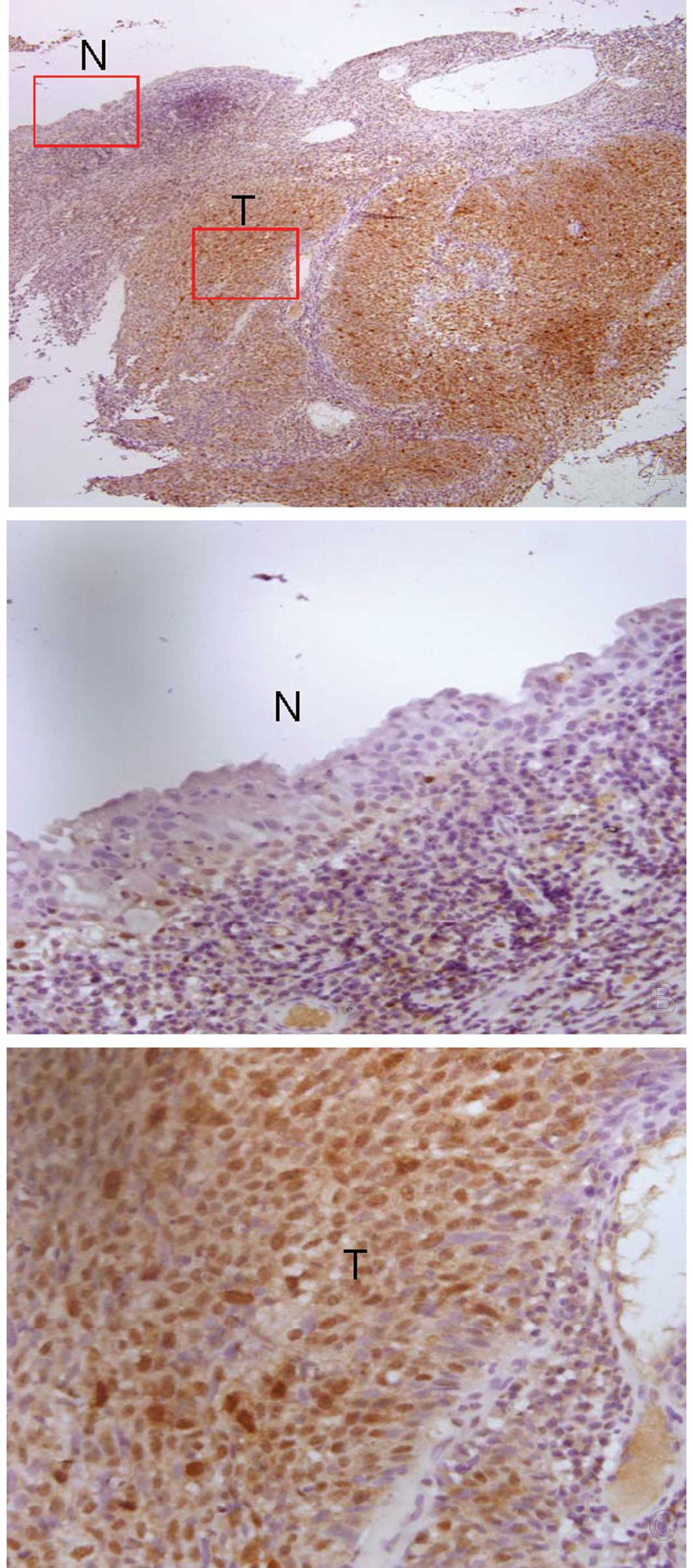 IHC staining was performed using Dako Envision system (Dako, Carpinteria, CA, USA) according to the manufacturer’s instructions. Briefly, paraffin sections (4 μm) were baked for 1 h at 65°C. The sections were deparaffinized in xylenes and rehydrated with graded ethanol to distilled water. The sections were submerged into EDTA antigenic retrieval buffer (pH 8.0) and microwaved for antigenic retrieval. After being treated with 0.3% H2O2 for 15 min to block the endogenous peroxidase, the sections were treated with normal goat serum for 30 min to reduce the non-specific binding, and then rabbit polyclonal anti-Aur-A antibody (1:300; Upstate Biotechnology, Charlottesville, VA, USA) was incubated with the sections overnight at 4°C. After washing, the sections were incubated with horseradish peroxidase (HRP) at 4°C for 30 min. Diaminobenzidine (DAB) was used for the color reaction. For the negative controls, the antibody was replaced with normal goat serum.