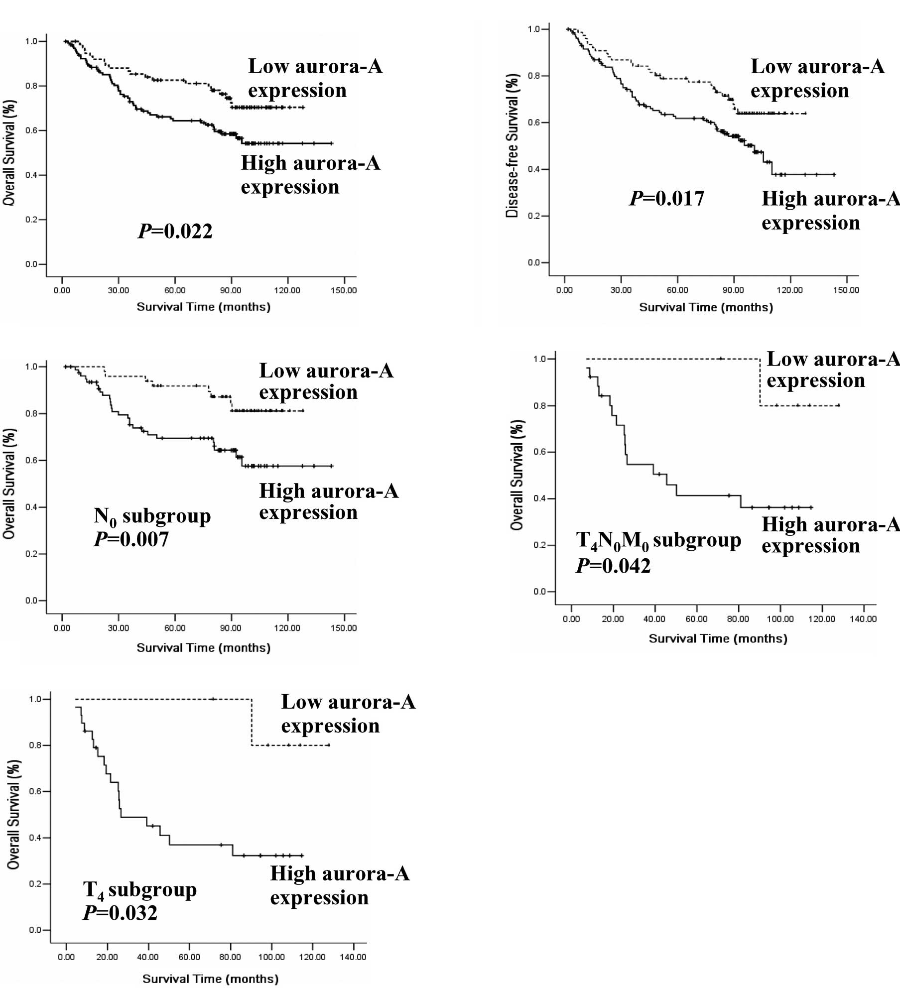 Aur-A was capable of predicting the clinical outcome of patients in the T4N0M0 subgroup. Thus, we aimed to verify the correlation between Aur-A expression and the clinical outcome of T4 patients. We divided all cases into T1–2, T3 and T4 subgroups. As expected, in the T4 subgroups, a high Aur-A expression had a poor clinical outcome (n=35; log-rank, P=0.032; Fig. 2E), whereas Aur-A expression had no correlation to clinical outcome in either T1–2 or T3 subgroups (P=0.415 and P=0.498). Thus, regardless of N or M status, a high Aur-A expression indicated poor prognosis in T4 patients.