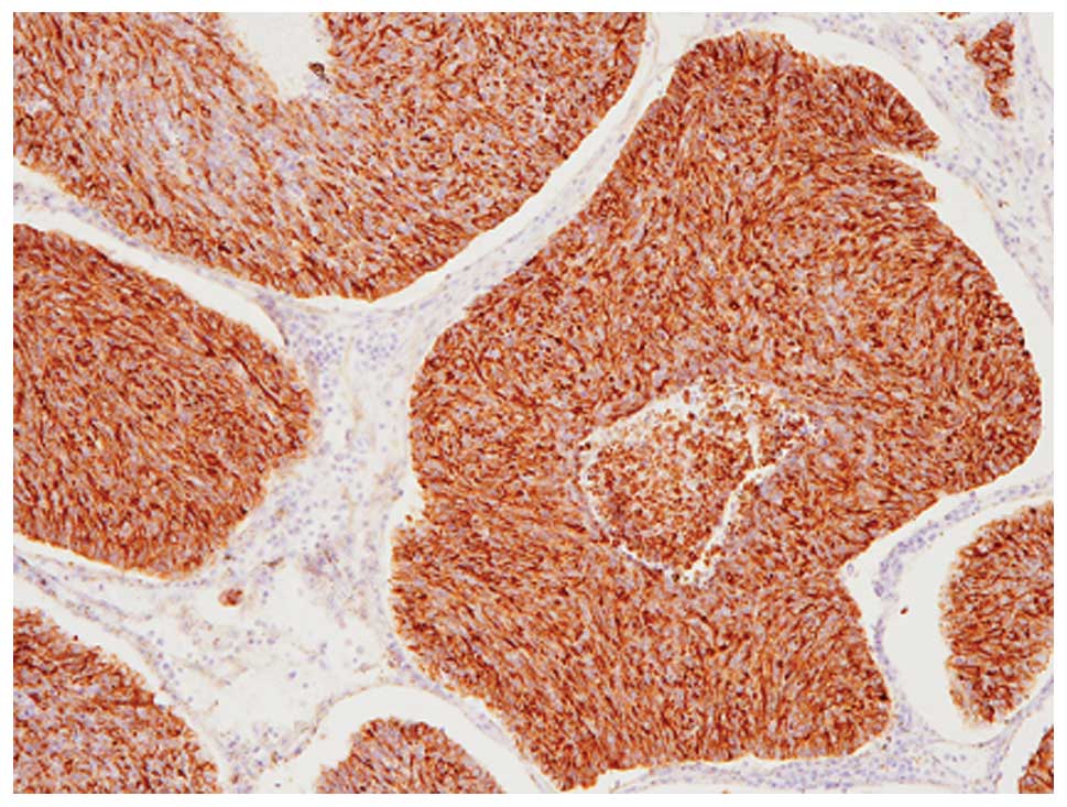 According to the WHO Classification, NEC of the breast is classified into three subtypes: solid neuroendocrine carcinoma, small cell/oat cell carcinoma, and large cell neuroendocrine carcinoma (1). The histopathological features of the present case corresponded to solid NEC of the breast, which is the most common subtype (5), since the tumor was composed of solid nests with or without central necrosis separated by delicate fibrovascular stroma, which suggested neuroendocrine differentiation, and no poorly differentiated component was observed. López-Bonet et al summarized the clinicopathological and immunohistochemical features of seven cases of solid NEC of the breast (2). Results of their study showed that solid NEC of the breast mainly affects the elderly (the median age of the patients was 63), and the frequency of axillary lymph node metastasis is relatively high (3/6 cases underwent lymph node removal) (2). Immunohistochemically, ER and PgR were positive in all cases, as in the present case (2), and overexpression of HER2 is uncommon in NEC of the breast (2,5). Moreover, the expression pattern of neuroendocrine markers is variable; all cases reported by López-Bonet et al demonstrated positive immunoreactivity for synaptophysin (>50% of tumor cells), but chromogranin A expression was observed only focally in five of their seven cases (the remaining two cases demonstrated no positive immunoreactivity for chromogranin A) (2). By contrast, Sapino et al reported that 53% of NEC expressed chromogranin A (>50% of tumor cells) (6).
