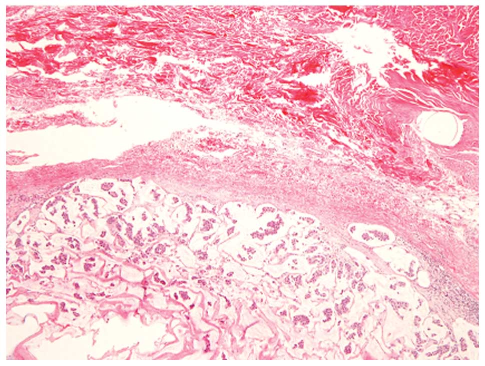 Solid NEC of the breast with a mucinous carcinoma component is rarely reported (2). In the present study, we report a case of solid NEC of the breast with a mucinous carcinoma component and discuss the tumorigenesis of this rare lesion.