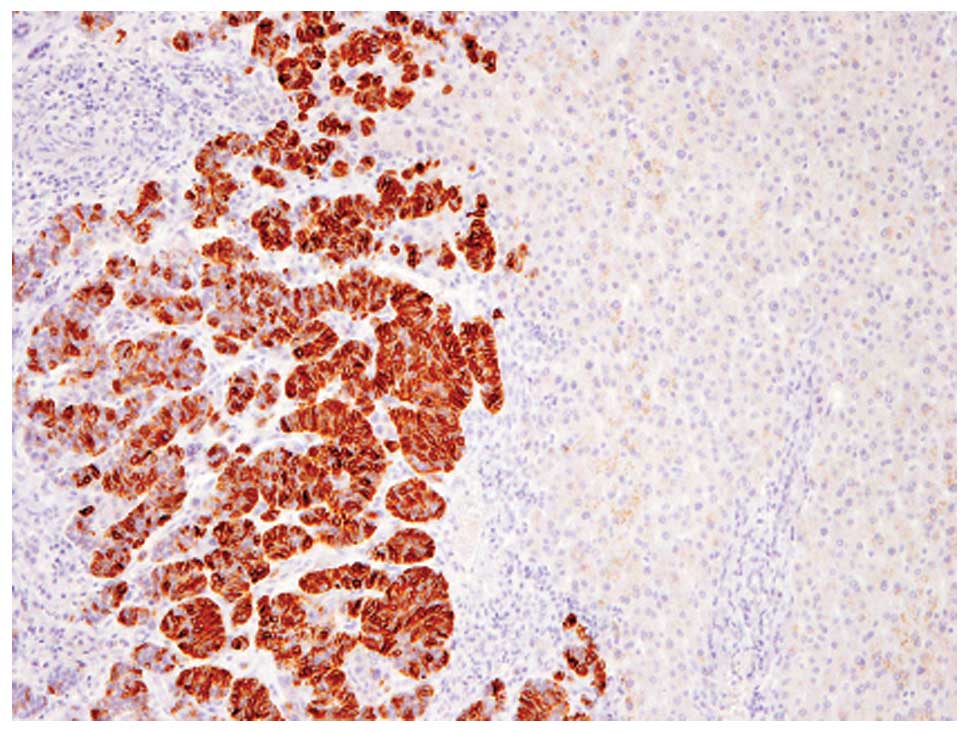 A 37-year-old Japanese female presented with a right breast tumor. A physical examination revealed a relatively well-circumscribed tumor, measuring 3×2.5 cm in diameter, in the right breast and swollen right axillary lymph nodes. No metastatic lesions with the exception of the right axillary lymph nodes were detected by computed tomography (CT). The biopsy specimen of the right breast tumor revealed invasive carcinoma; thus, total mastectomy and removal of the right axillary lymph nodes were performed (cT2N1M0, stage IIB). Chemotherapy and hormonotherapy were administered following the surgery. Three years later, local recurrence was observed on the operation scar of her right thoracic wall, and tumor resection was performed again. Seven years after the first surgery, a liver tumor was detected during the follow-up CT. CT and magnetic resonance imaging demonstrated a relatively well-circumscribed tumor, measuring 42×37×30 mm, in S3 (Fig. 1). Metastatic breast cancer in the liver was suspected clinically, resulting in the surgical resection of the liver tumor. The post-operative course was uneventful, and the patient has been free from recurrence for 18 months of medical follow-up.