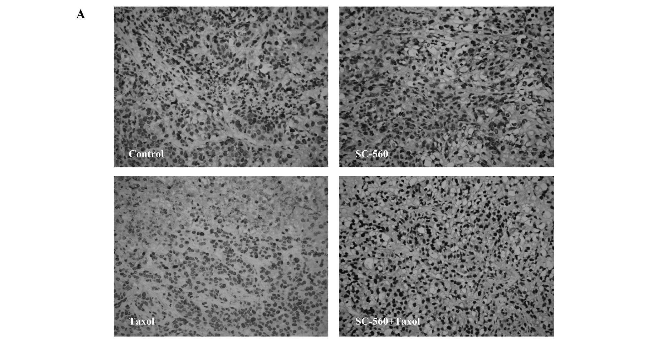 We assessed cell growth in xenograft tumors in nude mice treated with vehicle, SC-560, taxol and SC-560/taxol using proliferation-associated nuclear antigen (Ki-67) staining. The quantification of the Ki-67-positive cells in the tumors revealed that SC-560 combined with taxol treatment in nude mice resulted in a marked decrease in the proliferation index compared with the control group (Fig. 4A). Data on the proliferation index in the four groups are shown in Fig. 4B. In the SC-560 group, the proliferation index was 12.00±2.13%, which is statistically significant compared with that of the control group (24.67±4.61%, P<0.05). The combination group demonstrated a notable reduction in the proliferation index (8.67±1.15%) compared with the control group (P<0.01). In addition, the combination group demonstrated a greater reduction in the proliferation index compared with the taxol group (P<0.05).