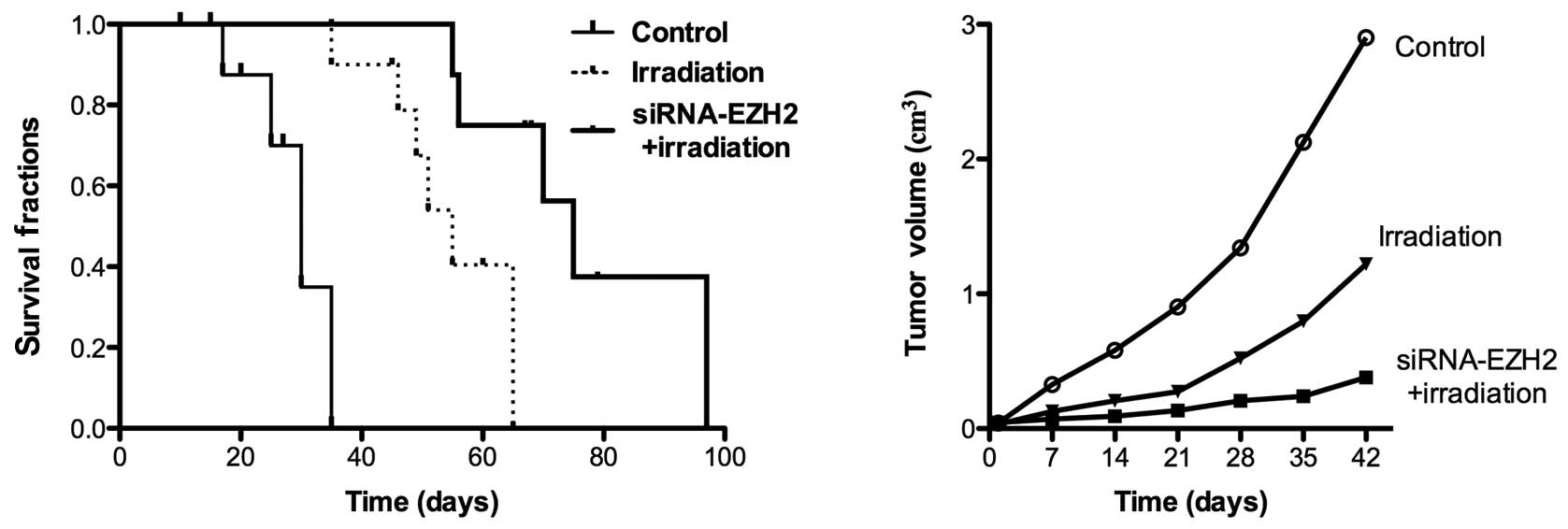 Xia H, Yu C, Zhang Y, Yu J, Li J, Zhang W, Zhang B, Li Y and Guo N: EZH2 silencing with RNAi enhances irradiation-induced inhibition of human lung cancer growth in vitro and in vivo. Oncol Lett 4: 135-140, 2012.
