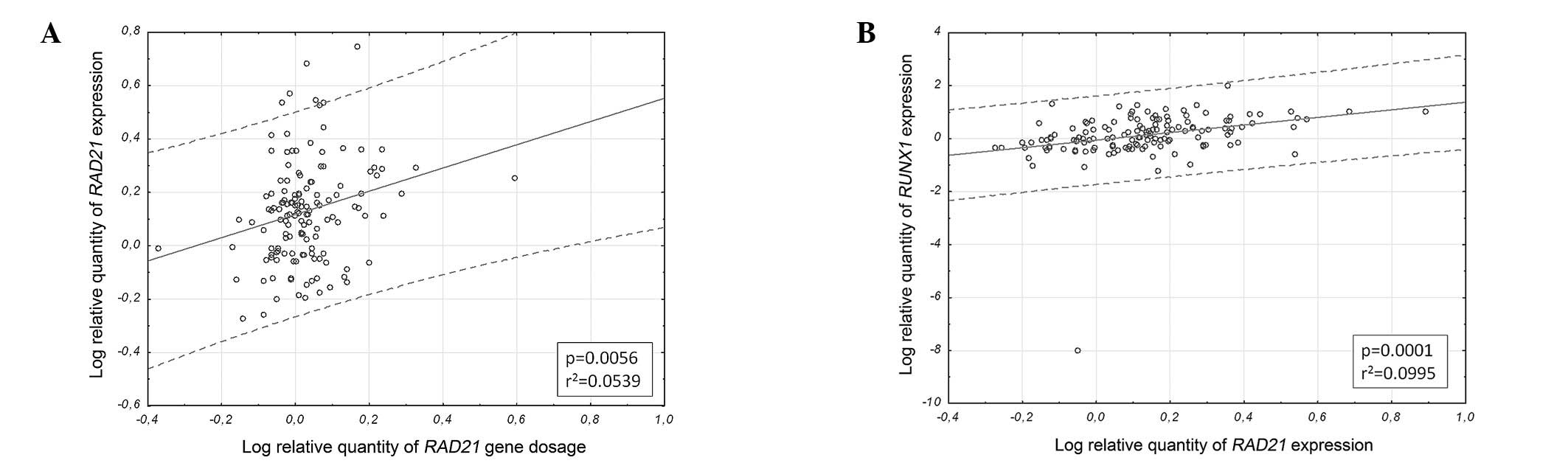 All statistical analyses were performed using the STATISTICA software, version 10. Logarithmized relative quantities of RAD21 gene dosage together with RUNX1 and RAD21 expression levels were assessed by Spearman correlation and Crosstabs statistics with Pearson’s chi-square test. Various comparisons of the results and clinicopathological data were performed with the nonparametric statistics, including the Mann-Whitney U test (Table II). P<0.05 was considered to indicate a statistically significant result.