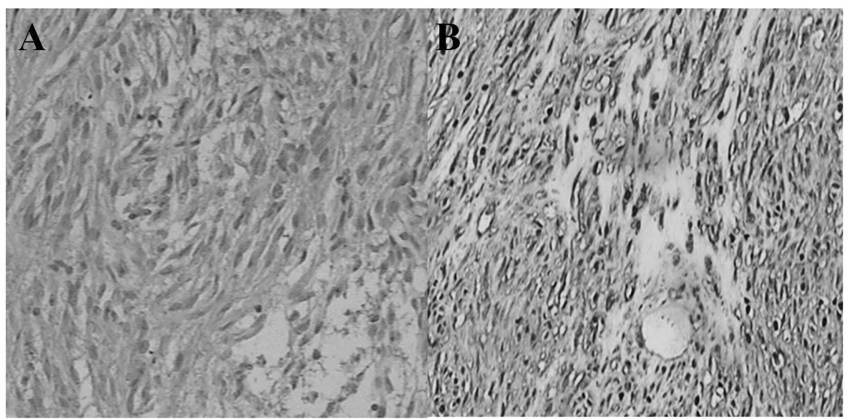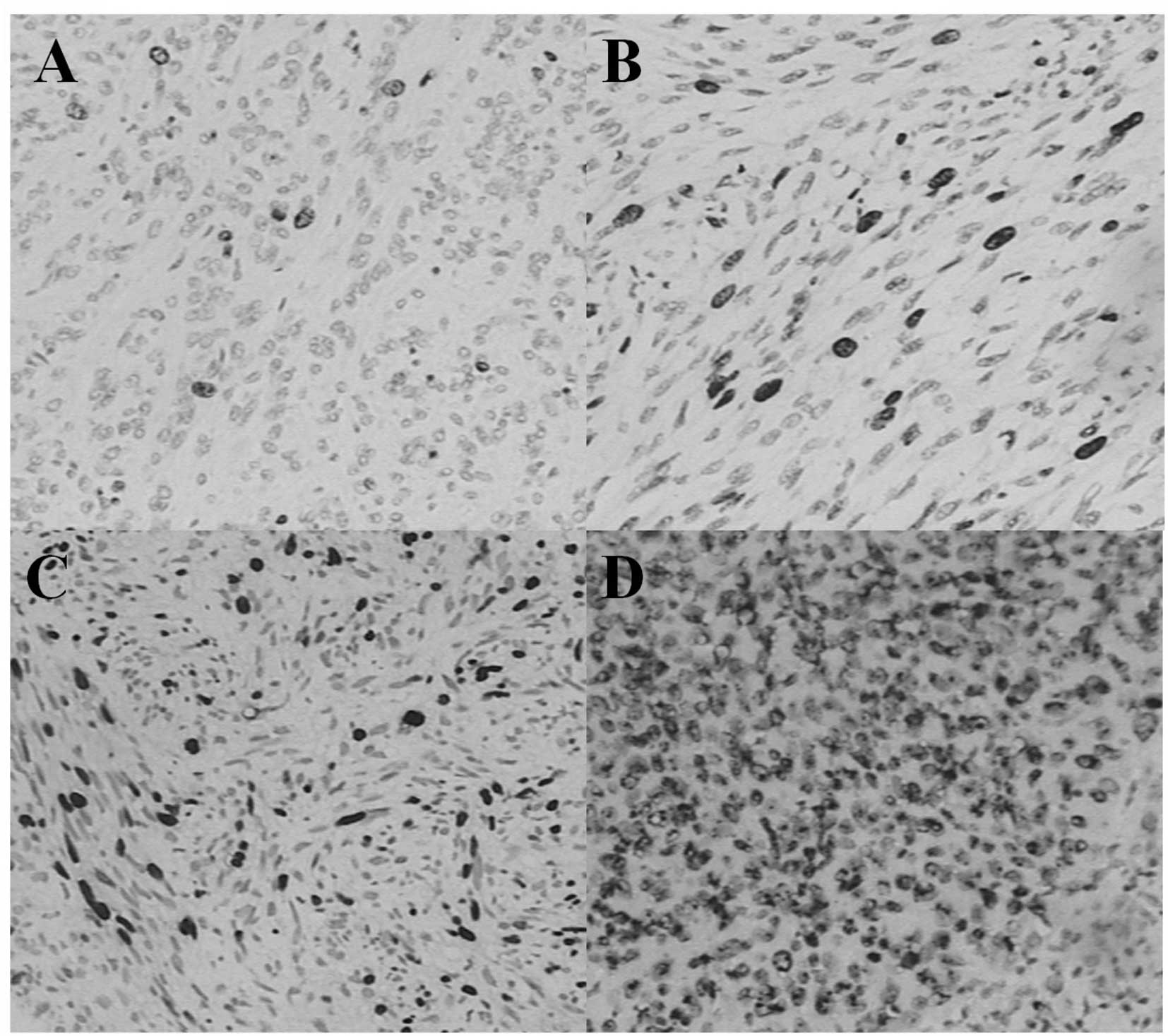 An exploratory data analysis was performed using SPSS 17.0 (SPSS Inc., Chicago, IL, USA) and Excel 2007 (Microsoft Corporation, Redmond, WA, USA). All criteria were rated equally significant, without the adjustment of P-values for multiple testing. Tumor size and age were considered to be continuous variables, while positivity for immunohistochemical markers, the mitotic rate and gender were treated as categorical variables. P<0.05 was considered to indicate statistically significant diferences (α= 0.05). No correction for multiple testing was performed.
