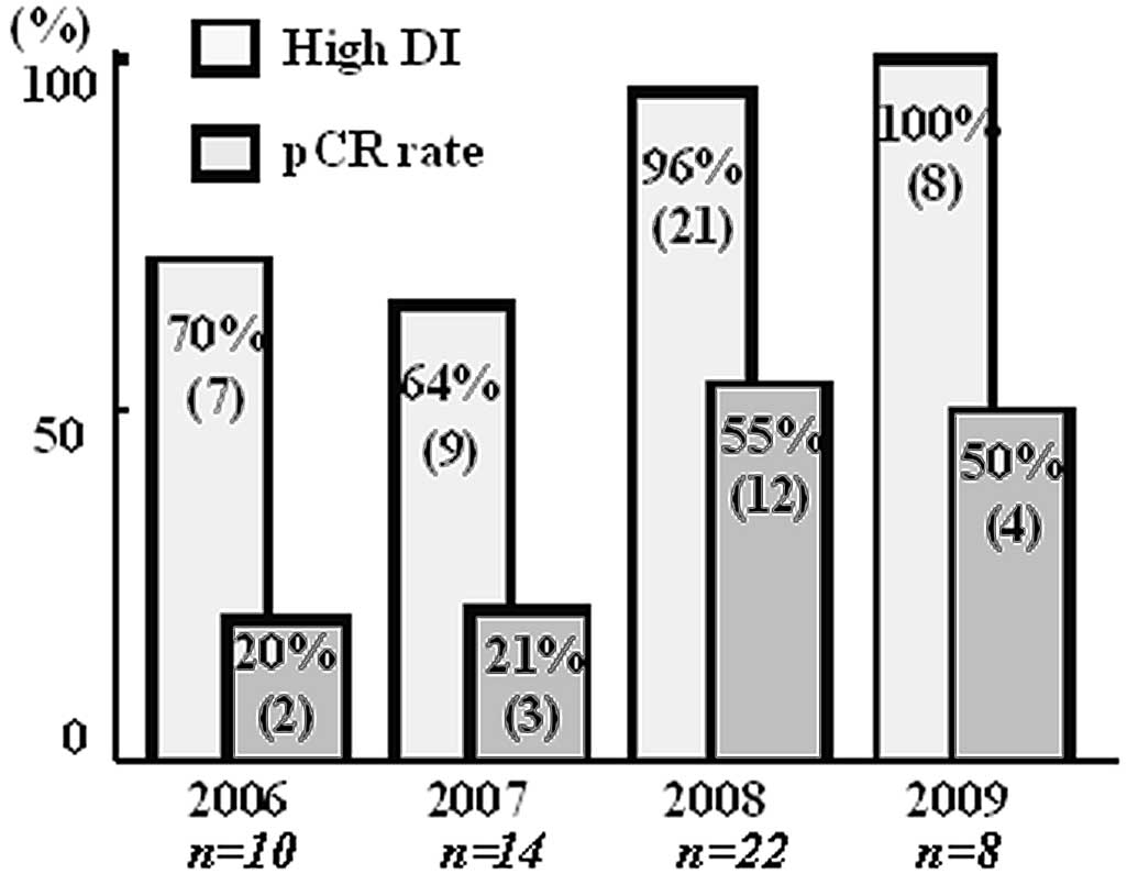 Sequential administration of anthracyclin and taxane for neoadjuvant chemotherapy (NAC) is the standard treatment for operable breast cancer. The pathological complete response (pCR) is a significant predictor of overall survival (OS), regardless of treatment. In this study, the pCR rate was retrospectively examined and compared with the treatment efficacy and the characteristics of pCR patients were analyzed. A total of 54 female patients with operable breast cancer, treated with FEC 100 followed by weekly paclitaxel between December 2005 and May 2009 at the Osaka City University Hospital, Osaka, Japan, were retrospectively reviewed. A total of 21 patients (39%) achieved pCR. The overall response rate was 91%. Only one patient had progressive disease. The pCR rate was significantly higher in those patients with estrogen receptor (ER)- and progesterone receptor (PR)-negative tumors and in those patients who completed the treatment course. An NAC regimen incorporating FEC 100 followed by weekly paclitaxel is effective for treating operable breast cancer.