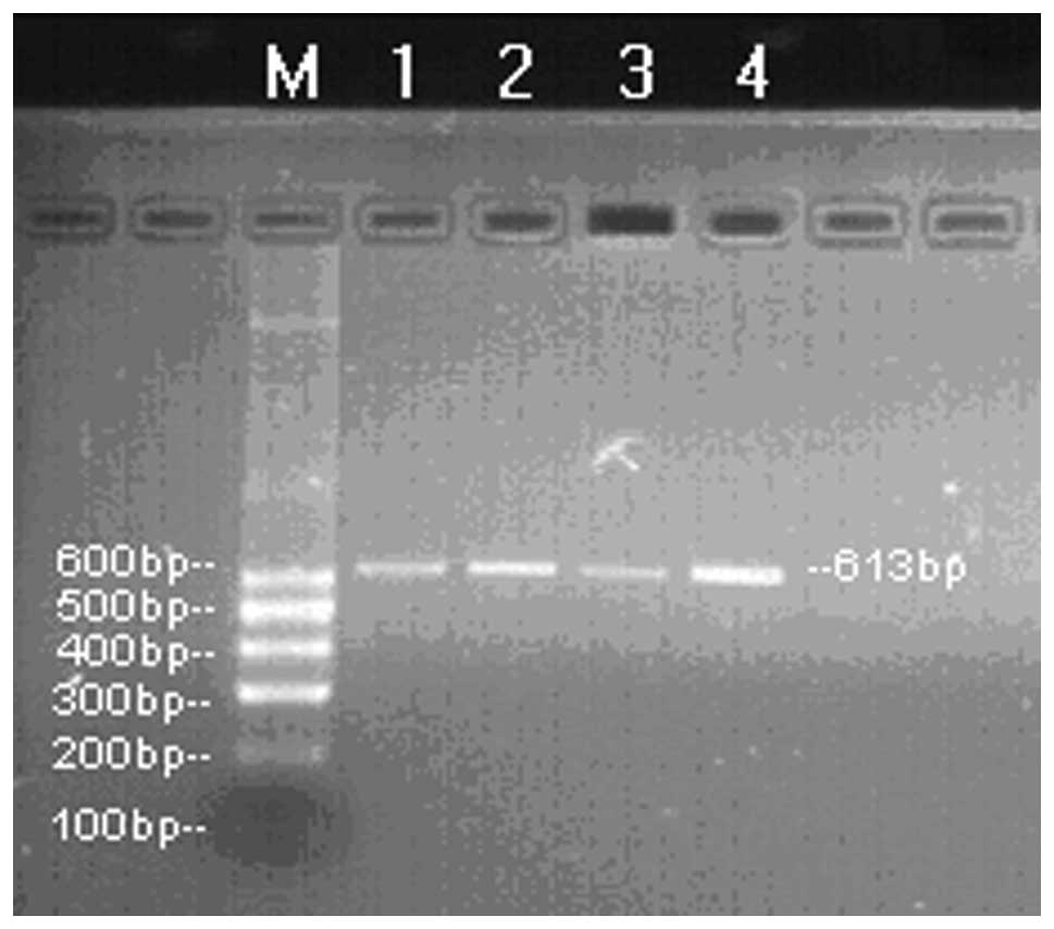 H-ras mRNA was amplified in all the clinical samples. Electrophoretic analysis showed a bright band ∼600 bp in length in these patients. The electrophoresis band was clear and there was no dispersive band, indicating its high specificity (Fig. 1).