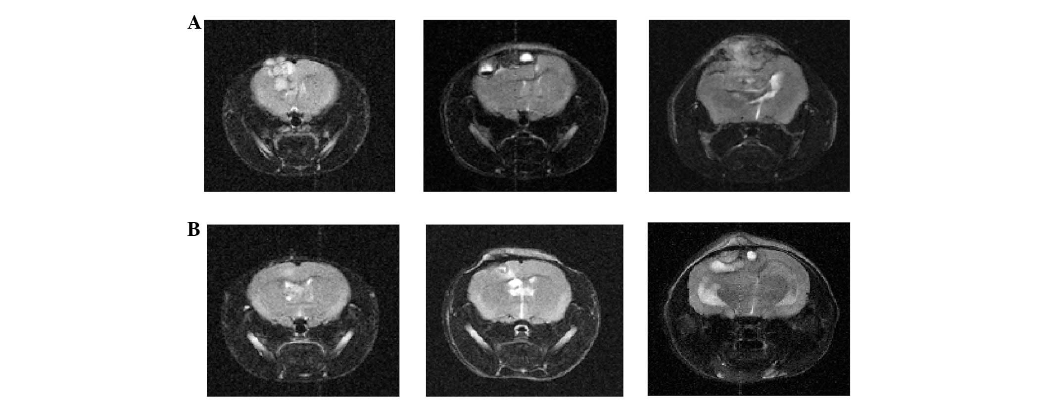 The nude mice were anesthetized with an intraperitoneal (i.p.) injection of 12 mg/kg xylazine (Rompun; Cutter Laboratories, Shawnee, KS, USA) and 30 mg/kg ketamine (Ketalar; Parke-Davis & Co., Morris Plains, NJ, USA). The mice were then stereotaxically inoculated with 1×106 NCI-H358 cells into the right frontal lobe (2 mm lateral and 1 mm anterior to the bregma, at a depth of 2.5 mm from the skull) using a sterile Hamilton syringe fitted with a 26-gauge needle (Hamilton Co., Reno, NV, USA) and a microinfusion pump (Harvard Apparatus, Holliston, MA, USA). Intracranial tumors were confirmed by cranial magnetic resonance imaging (MRI). All MRI experiments were performed on a 4.7 T animal MRI scanner (BioSpec 47/40, Bruker, Germany) with a quadrature volume coil (diameter, 25 mm) at the Korea Basic Science Institute in Ochang, Korea.