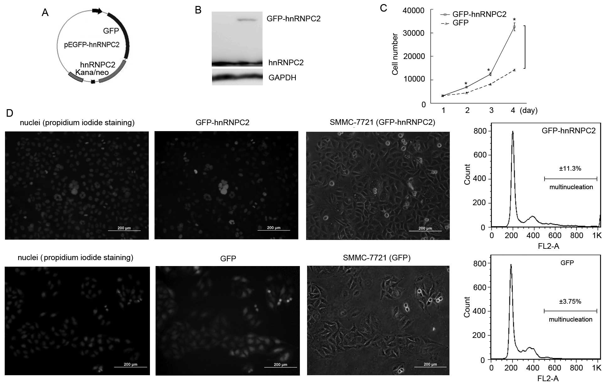 To reveal whether there was a positive correlation between hnRNPC2 and multinucleation, we constructed a eukaryotic expressional vector pEGFP-hnRNPC2 (Fig. 1A) and transfected it into hepatocellular carcinoma SMMC-7721 cells. Western blot results revealed that GFP-hnRNPC2 is expressed at 48 h post-transfection (Fig. 1B). Following screening by geneticin, GFP-hnRNPC2-expressed cell colonies were all obtained under fluorescent microscope and mixed into one culture. Then, cell proliferative rate tests were carried out and the results revealed that the exogenous hnRNPC2-expressed cells (hnRNPC2 overexpression) accelerated their proliferation (Fig. 1C). Notably, under the fluorescent microscope, we found that a number of those cells showed more than two nuclei, glowing green fluorescence, in a cell with an expanded cytoplasm (Fig. 1D). To evaluate the number of cells with multinucleation as a result of overexpressed hnRNPC2, fluorescent microscopy and flow cytometry were used. As Fig. 1D shows, hnRNPC2-overexpressing SMMC-7721 cells possessed more multinucleated cells; nearly 11.3% cells were induced to multinucleation, while the control cells showed 3.8% multinucleated cells. Furthermore, when pEGFP-hnRNPC2 was transfected into breast cancer BT549 cells and noncancerous hepatocellular HL-7702 cells, they showed similar results (data not shown). Collectively, these results indicate that overexpression of hnRNPC2 is capable of inducing multinucleation in hepatocellular carcinoma cells and this effect may be universal.