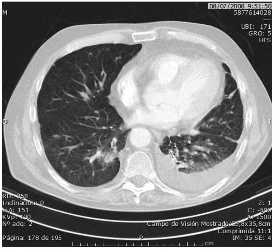 The patient received adjuvant radiotherapy in the left renal fossa during the phase II trial. Two years later, a CT scan revealed multiple predominant lower lobe metastases. The largest tumor was 2 cm in size and located in the lower left lobe. In December 2002, a first-line treatment with three cycles of intravenous interleukin plus IFN was started; however, there was no response to the therapy. Disease stabilization was achieved following the initiation of cycles of vinblastine and IFN. After 12 cycles of this combination treatment, IFN was administered as a monotherapy. In June 2005, novel progression of the disease to the lungs was revealed. Subsequently, the patient received inhaled interleukin therapy, resulting in the stabilization of the disease over the following 16 months. In October 2006, the CT scan demonstrated an increase in the number and size of bilateral multiple lung metastases (Fig. 1). Fourth-line treatment with sunitinib was subsequently started, and this achieved a long-term partial response over the next 20 months. In July 2008, a new lung relapse was detected (Fig. 2), accompanied by three poor prognostic factors (a low hemoglobin level of <10 g/dl, a serum calcium level of >10 mg/dl and a lactate dehydrogenase level of 709 IU/l). Fifth-line treatment for metastatic disease with 25 mg intravenous temsirolimus once a week was started and disease stabilization was achieved in 13 months. During this period, temsirolimus was discontinued on two occasions. The first incident was due to toxicity (hypothyroidism, G3), which occurred after 10 months of treatment. Severe asthenia and lethargy interfered with activities of daily living in the patient and the results of blood tests were: TSH, 92 μIU/ml; free serum triiodothyroxine (FT3), 0.15 pg/ml (2.60–5.10); and free serum thyroxine (FT4), 0.26 ng/dl (1.00–1.80). The patient achieved normal thyroid function after temsirolimus therapy had been withdrawn for three weeks. In the second instance, the treatment was ceased due to the occurence of mumps accompanied by a high fever; this was treated with antibiotics and anti-inflammatory drugs. Two weeks later, temsirolimus therapy was resumed by lowering the dosage to 20 mg. Notably, other toxicities were observed in this case, including a G2 rash, G2 anemia, G2 leukopenia, G2 hypertriglyceridemia and G1 hypercholesterolemia. In August 2009, the lung disease progression was diagnosed as a massive pleural effusion and treatment was discontinued following evacuation by thoracentesis (Fig. 3).