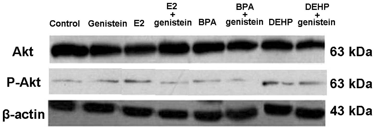 The aim of this study was to examine the effect of genistein on human neuroblastoma cell proliferation induced by two common environmental endocrine disruptors, bisphenol A (BPA) and Di-2-ethylhexyl phthalate (DEHP), and to investigate its underlying mechanism. SK-N-SH human neuroblastoma cells were treated with E2 (1 ng/ml), BPA (2 µg/ml) or DEHP (100 µM), with or without genistein (12.5 µM) in vitro. The number of viable cells was detected with an absorbance reader after 0, 24, 48 or 72 h treatment. The percentage of cells in different phases, and expression of Akt and its phosphorylation levels were also assessed by flow cytometry and western blot analysis at 72 h, respectively. The BPA and DEHP groups had a 30% higher number of viable cells compared to the non-treated group at 48 h (P<0.001). However, the cell numbers did not increase significantly in the groups with additional treatment with genistein (P>0.05 vs. control) and the same trend was observed at 72 h. The expression of phospho-Akt protein was increased in the groups treated with BPA or DEHP compared to the control group at 72 h (P<0.05), while no significant elevation in the expression of phospho-Akt was observed (P>0.05) in genistein-treated groups. Cells were arrested at the G2/M phase by genistein. Similar effects were observed in the E2 group with or without genistein treatment. Akt protein expression had no significant change among all the groups (P>0.05). In conclusion, estradiol- or environmental endocrine disruptor-induced proliferation of human neuroblastoma cells is effectively abolished by genistein, likely in a cell cycle- and Akt pathway-dependent manner.