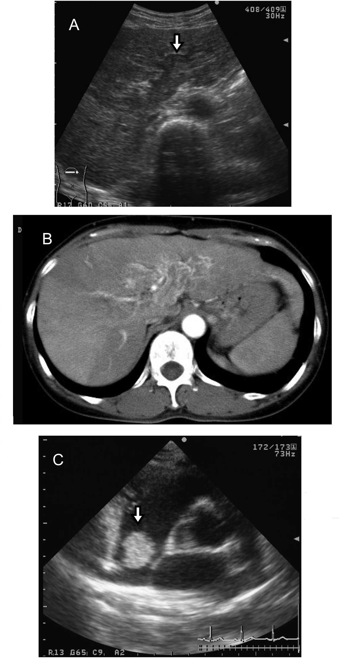 Abdominal sonography and computed tomography (CT) imaging revealed a large mass reaching from the right to the left lobe and a tumor thrombus in the main portal vein (Fig. 1A and B). Angiography revealed a hypervascular tumor in the right lobe exhibiting the thread and streak sign. No metastases were identified in the right atrium (RA) or inferior vena cava (IVC) prior to starting intraarterial chemotherapy with cisplatin, 5-fluouracil, adriamycin and mitomycin.