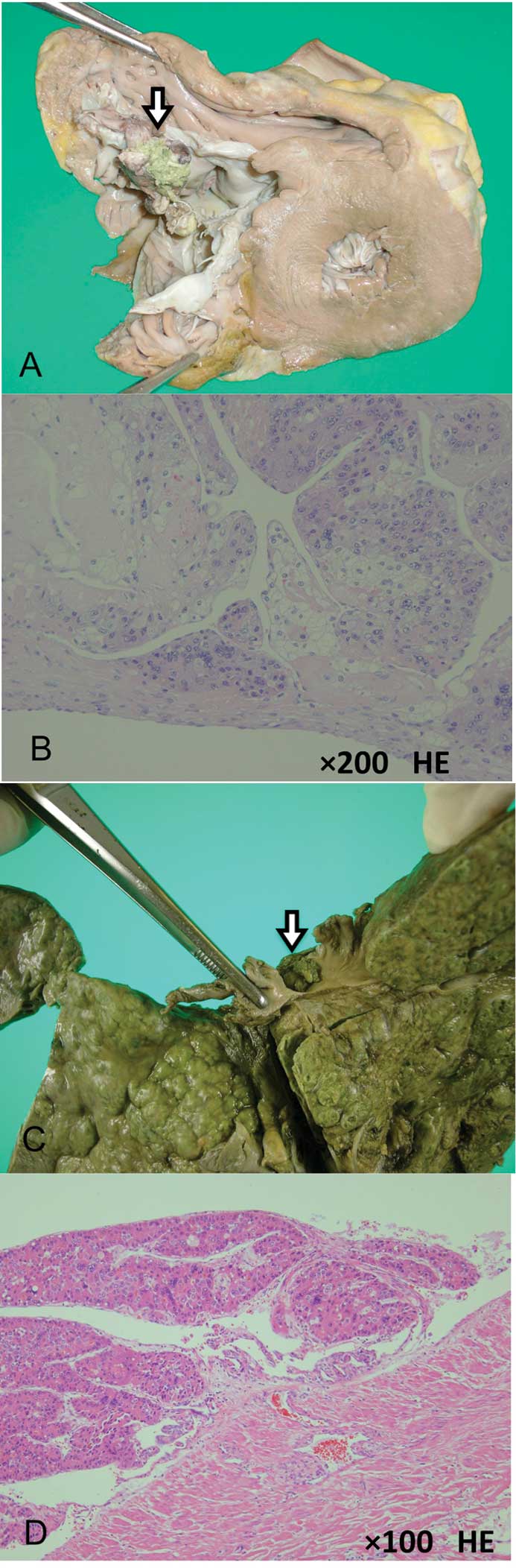 An autopsy revealed diffuse-type HCC in the bilateral lobes of the liver that weighed 1,365 g, with a tumor thrombus in the main trunk of the portal vein, bilateral multiple lung metastases and tumor thrombi in the artery of the right upper lung. A yellowish irregular-surfaced mass with a diameter of 10 mm located in the RA, and a similar small independent mass in the IVC (Fig. 3), were discontinuous with the intrahepatic HCC. Histologically, the intrahepatic and right atrial tumors were moderately differentiated HCCs. The right atrial tumor was fixed to the atrial wall and arose from sites on the endocardium of the RA (Fig. 3A and B). The small tumor in the IVC was similarly fixed to the endothelium (Fig. 3C and D).