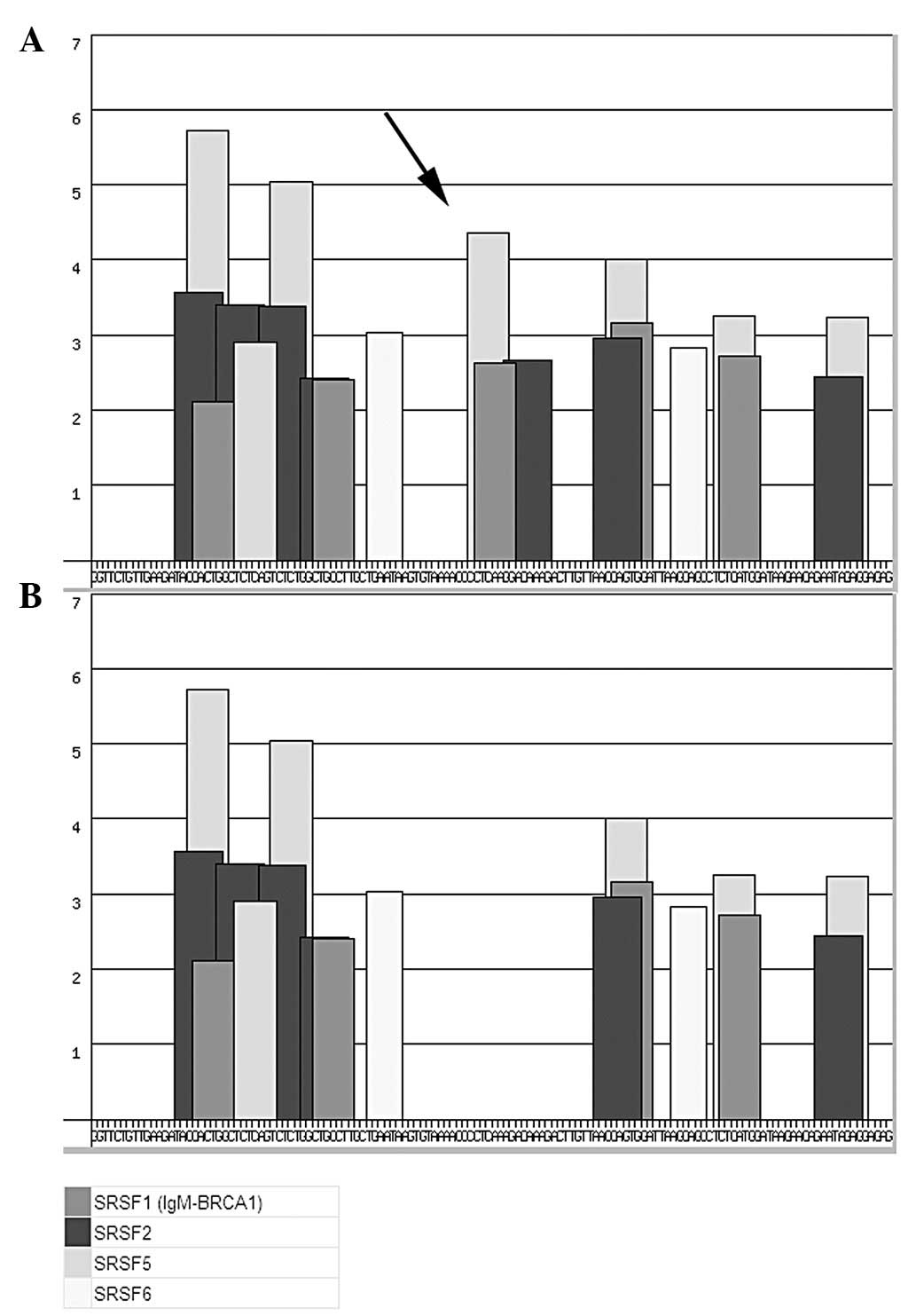 We analyzed wild-type or mutant exon sequences from MLH1 and MSH2 genes in Table I using SR protein score matrices and threshold values, essentially as described. Potential ESE motifs found in the mutations in the two genes are listed in Table I (Fig. 1). Some of the mutations may load in different potential ESE motifs. Of the 114 mutations analyzed, 47 (41.2%) mutations resulted in 68 ESE motif scores (24 SF2/ASF [IgM-BRCA1], 13 SC35, 19 SRp40 and 12 SRp55) being eliminated. However, 38 (33.3%) mutations created 45 ESE motif scores (12 SF2/ASF [IgM-BRCA1], 8 SC35, 14 SRp40 and 11 SRp55).