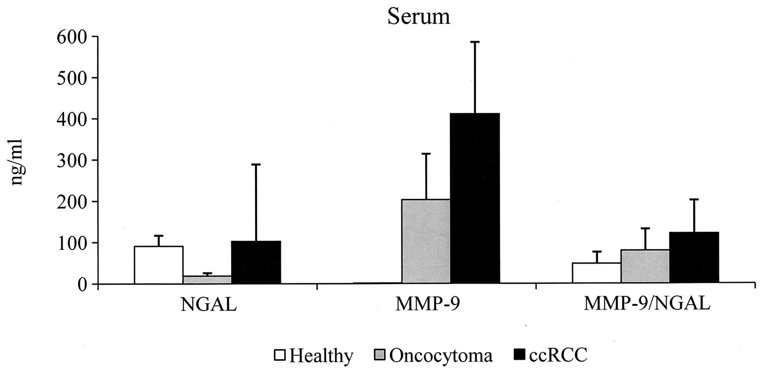 Evaluation of neutrophil gelatinase-associated lipocalin (NGAL), matrix metalloproteinase‑9 (MMP‑9) and their complex MMP‑9/NGAL in sera and urine of patients with kidney tumors