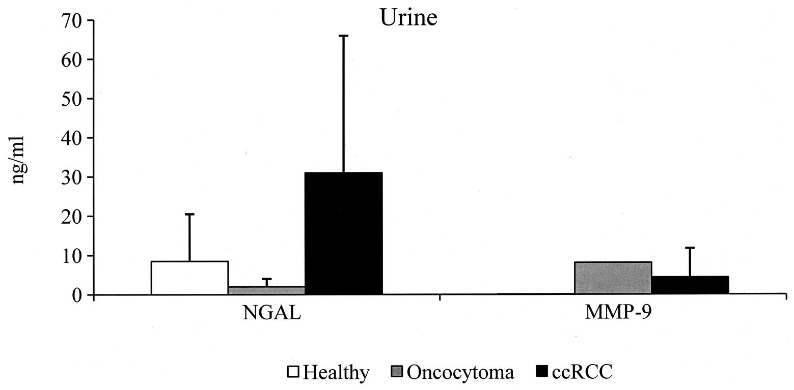 Mean + standard deviation of urinary NGAL and MMP-9 expression. NGAL, neutrophil gelatinase-associated lipocalin; MMP-9, matrix metalloproteinase 9; ccRCC, clear cell renal cell carcinoma.