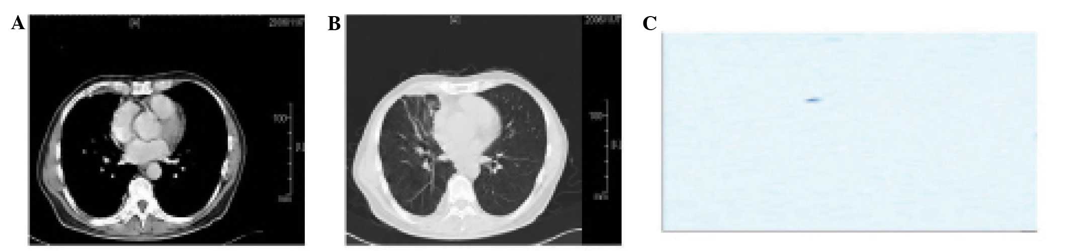 A 62-year-old male patient (weight, 65 kg; height, 166 cm) was admitted to Changhai hospital, The Second Military Medical University (Shanghai, China), due to coughing and chest pain that had occurred for 5 months. The patient had suffered an unexplained dry cough since September 2005, accompanied by chest tightness and pain. In March 2006, a chest X-ray showed a shadow in the right lower lung with a small amount of pleural effusion. The chest computerized tomography (CT) showed a 2×1.5 cm block shadow in the right lower lung, a medium dose pleural effusion in the right chest cavity and certain mediastinal lymph nodes with calcification (Fig. 1A and B). The emission CT (ECT) showed numerous bone metastases. On March 27th, 2006 (week 0), a tube was placed in the right chest cavity and drained 2400 ml of the pleural effusion. The entire pleural effusion was drained after 3 days and consisted of ∼3,020 ml in total. Adenocarcinoma cells were identified in smears of the pleural effusion (Fig. 1C) and the diagnosis from a Board Certified Pathologist was determined as that of a right lower lung adenocarcinoma (T4N2M1, stage IV). Following admission, the patient began to develop a severe headache with nausea and vomiting but without cranial and spinal nerve dysfunction, or signs of leptomeningeal irritation, such as Brudzinski’s or Kernig’s sign. There were no abnormal signs in the head magnetic resonance (MR; Fig. 2A and B) or gastroscopy images. In the first week, a lumbar puncture was performed and the pressure of the CSF was 18 cm H2O. The result of the test was colorless, positive for protein, had a total cell number of 10×106/l and contained cancer cells (Fig. 2C) (4). Chemotherapy was started with 1.8 g/day gemcitabine (from days 1–8) and 200 mg oxaliplatin (on day 1 only). The headache symptoms were notably eased after the first week and disappeared completely in the second week. The symptoms of coughing and chest pain were also alleviated. Chemotherapy was administered again in weeks 4 (cycle 2), 7 (cycle 3) and 9 (cycle 4). In week 12, the pressure of the CSF was 12 cm H2O. The CSF analysis was colorless, positive for protein, had a total cell number of 0/l and contained no cancer cells (Fig. 3C). The CT showed that the shadow in the right lower lung was 0.5×0.5 cm and that the pleura of the right chest was thickened (Fig. 3A and B). Another 4 cycles of chemotherapy were administered. The patient was monitored by monthly visits until January 30th, 2007 (week 44). During this time the patient was stable. On April 29th, 2007 (week 57), the primary tumor in the lung was observed to have progressed and 250 mg gefitinib a day was administered.