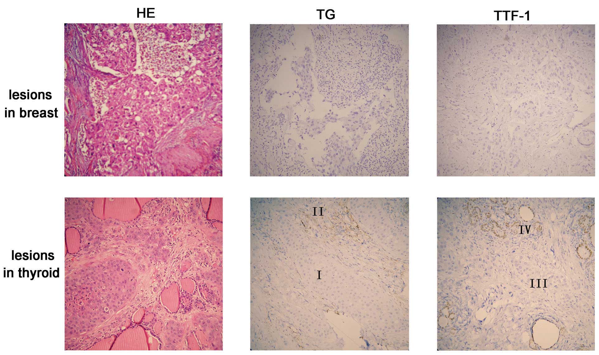 Histologically, pleomorphic tumor cells from the breast carcinoma metastasis were intermingled with the thyroid follicles (Fig. 1, hematoxylin and eosin staining of the adenocarcinoma tissue in the breast and thyroid gland). In the thyroid gland, clusters of metastatic breast carcinoma cells were surrounded by a normal thyroid component. Tumor cells in metastatic foci exhibited negative staining for the ER and PR and strong positive staining for CerbB-2, similar to the staining pattern of the primary breast lesion. The adjacent normal thyroid tissue was positive for TTF-1 (Fig. 2, lower panel, region IV) and TG (Fig. 2, lower panel, region II); however, the metastatic tumor cells were negative for both markers (Fig. 2, lower panel, regions III and I). These two markers indicate that the cancer lesions did not originate from the thyroid component.
