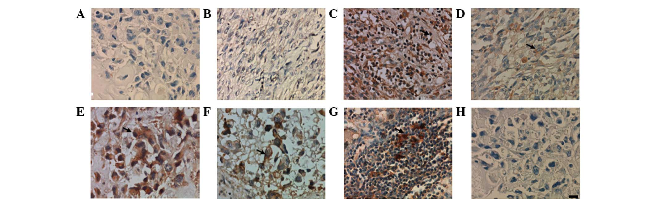 Axial and sagittal CT images demonstrated that tumor development originated from the bone (Fig. 1A and B). The specimens from all nine cases of osteosarcoma were highly cellular tumors consisting of enlarged round cells. The neoplastic cells showed the presence of cytological atypia, with multiple hyperchromatic and prominent nucleoli (Fig. 1C and D). Immunohistochemistry showed that TIM-3+ and TIM-4+, but not TIM-1+, cells were observed in all cases. These molecules were located on cell membranes and in the cytoplasm. However, the distributions of TIM-3 and TIM-4 were noticeably different. TIM-3 was identified on macrophages (Fig. 2A), infiltrated inflammatory cells (Fig. 2B) and tumor cells (Fig. 2C and D), and TIM-3+ cells were distributed throughout the tissue sections. TIM-4, however, was expressed on macrophage-like cells (Fig. 2E) and was absent from tumor cells (Fig. 2F). No positive results were observed in sections incubated with only secondary antibodies (goat IgG1), which were used as the negative controls (data not shown).