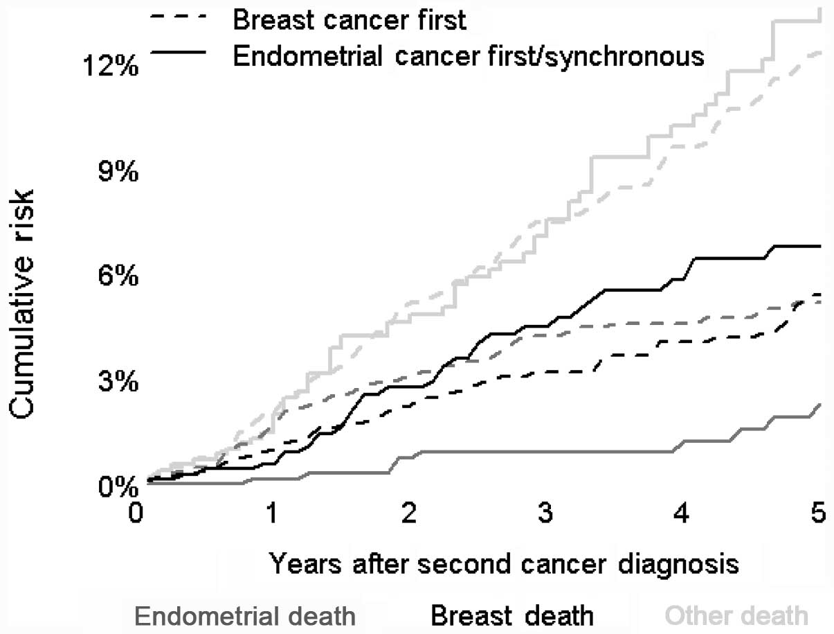 The present study provides the first mortality analysis of patients with either synchronous or metachronous breast and endometrial cancer, two commonly diagnosed cancers among women in the US. These findings should be considered when clinicians enter discussions concerning prognoses with patients of similar standing. It is important to encourage patients to continue surveillance for a second type of cancer even after they have been diagnosed with a primary type of cancer. It is equally important for clinicians to continue screening practices for other cancers for patients who have been treated for another cancer diagnosis. For example, women who have been diagnosed with endometrial cancer should be encouraged to continue to undergo annual screening mammography. Furthermore, it is of particular importance for clinicians to educate patients who have been treated with adjuvant tamoxifen for breast cancer on the signs and symptoms of endometrial cancer and the necessity of reporting these signs and symptoms to their physician in a timely manner so that diagnostic interventions may be utilized.