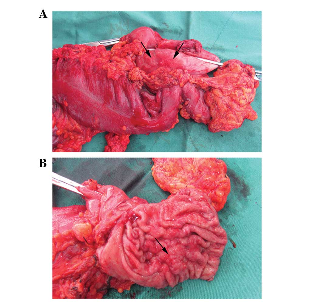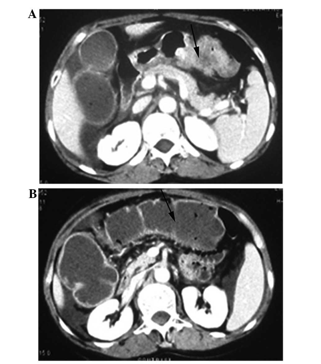 The poor prognosis of gastric cancer is mainly due to a late diagnosis (7). Therefore, an early diagnosis of the disease is the most significant factor in order to improve the results of treatment. However, an early diagnosis is difficult if a lesion is not identified in the stomach by a gastroscopy examination in the early stages. In certain cases, the diagnosis also relies on a combination of CT, magnifying endoscopy or endoscopic ultrasound techniques to analyze the symptoms, which are now the most common methods for detecting gastrointestinal invasion from gastric adenocarcinoma (8–11). The disease often characteristically manifests with a wall thickening detected by a helical CT. In the present case, the patient experienced abdomen pain, which may be associated with the oppression of the gastrointestinal tract due to cancer. The present study serves to illustrate the significance of a careful examination in all patients who present with symptoms of abdominal pain.
