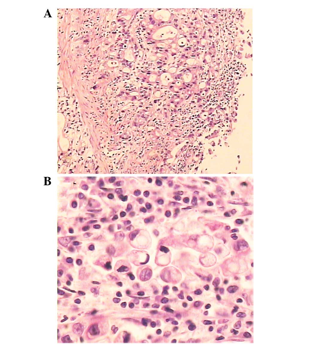 The patient underwent a radical distal gastrectomy with systematic lymph node dissection and a right colectomy (Fig. 3). The histology of the specimens indicated a poorly-differentiated adenocarcinoma with the presence of signet cells and cancer invasion to the transverse colonic mucosa (pT4; Fig. 4). No perigastric lymph node metastases were identified (0/15, pN0). The patient is currently doing well without recurrence at 18 months post-surgery.