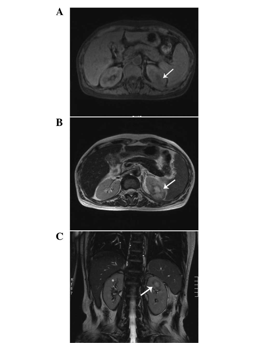 An IMT patient may be clinically asymptomatic or may present with flank pain, painless hematuria and ureteropelvic junction stenosis with hydronephrosis (12). Histologically, IMTs are characterized by a mix of inflammatory cells, including plasma cells, lymphocytes, eosinophils and bland spindle cells without nuclear atypia. The tumors may exhibit necrosis, hemorrhage, focal calcification and mitotic activity (6). Confirming a pre-operative diagnosis is difficult and the tumor may be misdiagnosed as renal cell carcinoma, as the symptoms and imaging findings are not specific and are particularly difficult to distinguish from renal cell carcinoma. Therefore, a nephrectomy is usually selected as a treatment strategy (13). Histological examination is of particular significance to obtain a clear diagnosis. However, an inadequate amount of tissue is often obtained by CT-guided fine needle aspiration. Therefore, the definitive diagnosis is often by histopathological examination of the resected specimen following surgery (14). IMT exhibits a good prognosis; Kapusta et al have reported a series of 12 cases of IMT of the kidney, of which the follow-up information was available in eight cases and ranged from 1 to 17 years, with no evidence of recurrence (12).