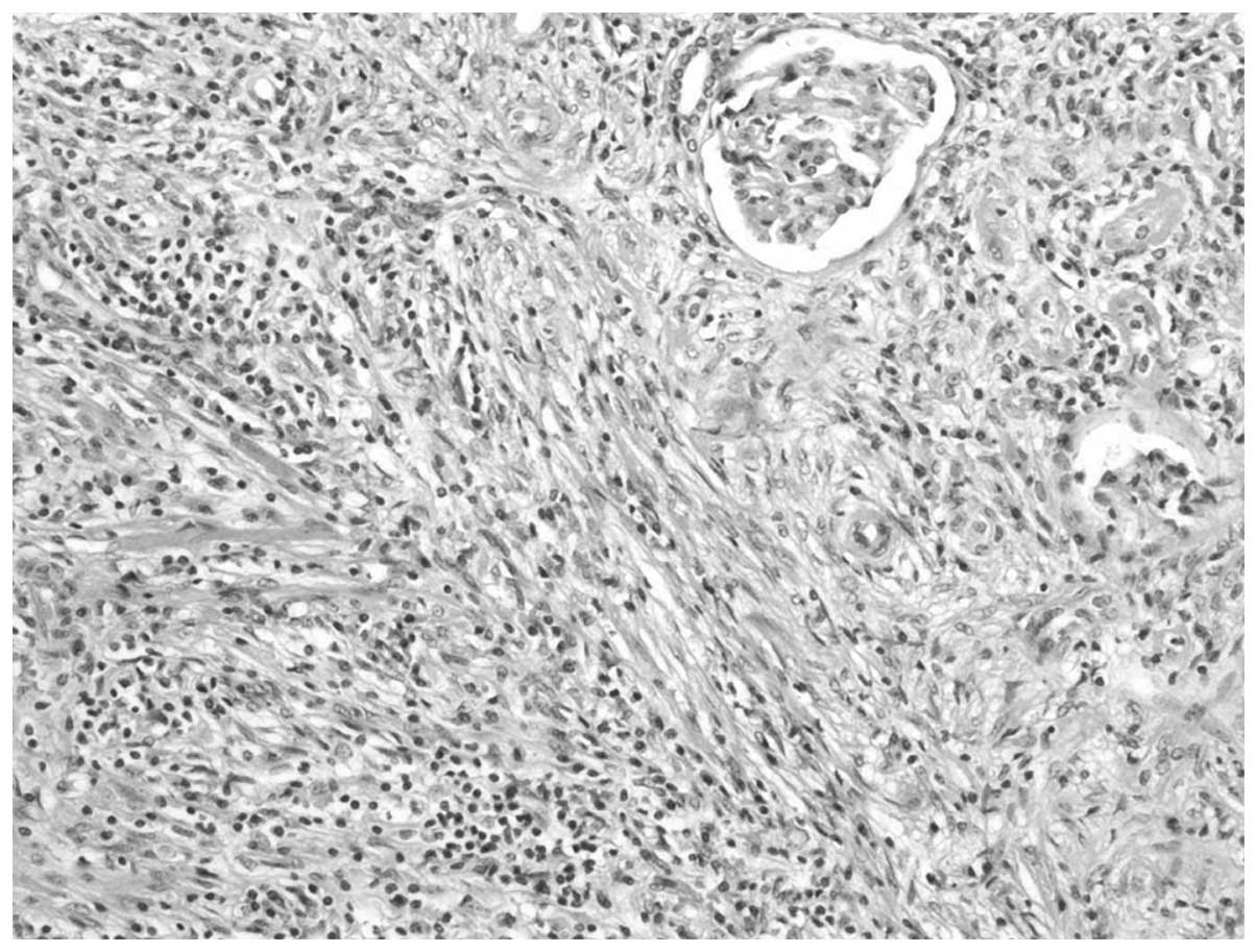 A 48-year-old female visited the First Hospital, Jilin University (Jilin, China) for routine check-up for hepatitis B on July 19, 2012 and presented with no symptoms. The patient had a history of trauma to the left hypochondrium 13 years previously and a history of hepatitis B for 20 years. The latter developed into hepatic cirrhosis, hypersplenism and coagulation disorders. The physical and basic paraclinical examinations were normal. Blood tests revealed a leukocyte count of 2850/mm3, a hemoglobin count of 5.6 g/dl, a platelet count of 6700/mm3, a urine leukocyte count of 20.1/HPF and a urine erythrocyte count of 2.5/HPF. The thrombin time was 19.4 sec and the prothrombin time was 14.0 sec. The international normalized ratio was 1.21, the prothrombin ratio was 1.22 and the prothrombin activity was 69%. Clinical laboratory measurments revealed the following levels: Serum fibrinogen, 0.55 g/l; hepatitis B virus surface antigen (HBsAg), 197.260 IU/Ml; hepatitis B virus e antigen, 0.299S/CO; hepatitis B virus e antibody, 0.110S/CO; and hepatitis B virus core antibody, 18.210S/CO. An abdominal ultrasonography revealed a 1.4×1.4-cm-sized mass with an obscure boundary in the upper pole of the kidney, which protruded through the surface. The computed tomography (CT) scan revealed a 1.6×2.9×2.0-cm lesion in the upper pole of the kidney. The CT was slightly enhanced with contrast (Fig. 1). The magnetic resonance imaging revealed a heterogeneous mass measuring 2.6 cm, showing low intensity on the T1-weighted images and high intensity on the T2-weighted images, which was accompanied with hypointensity that surrounded the center of the lesion (Fig. 2). A radical nephrectomy was performed. The histopathological examination resulted in the lesion being diagnosed as an IMT, in which spindle cells were admixed with variable amounts of extracellular collagen, lymphocytes and plasma cells (Fig. 3). Immunostaining was positive for vimentin and focally positive for smooth muscle actin, desmin and Ki-67 (Fig. 4). There was no evidence of recurrence during a follow-up period of six months.