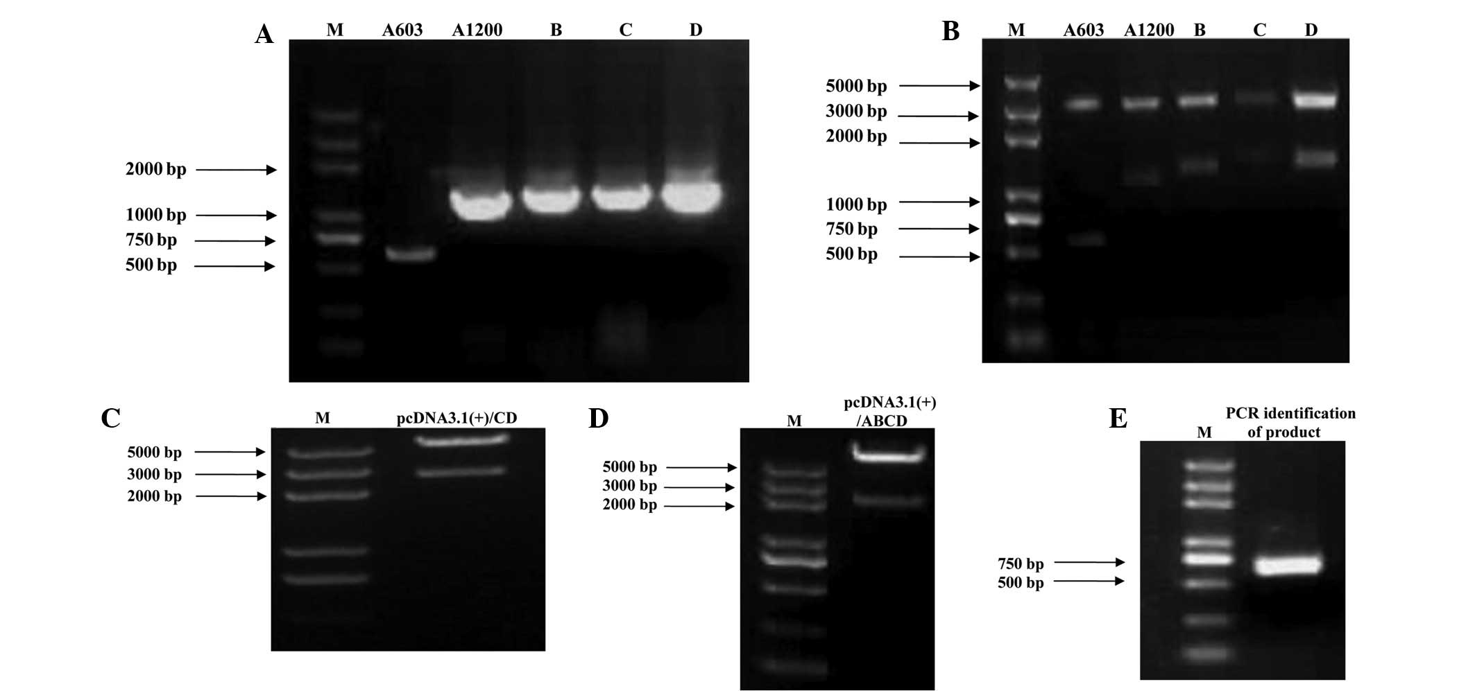 The amplicons were extracted from the agarose gel using the TIANgel Midi Purification kit (Tiangen Biotech Co., Ltd., Beijing, China) according to the manufacturer’s instructions. Each of the five amplicons were separately inserted into a T Trans1-T1 Phage Resistant vector (Promega Biotech Co., Ltd., Beijing, China), transformed into Trans1-T1 Phage Resistant competent cells, plated on agar containing ampicillin, and X-gal and white colonies were selected for further analysis. Following the expansion of the selected bacterial colonies, plasmid DNA was extracted by alkaline lysis (5). Restriction enzyme digests were used to validate successful recombination with final confirmation provided by sequencing. The sequencing results for each plasmid were compared with the NCBI sequences using the BLAST website. The five RIZ amplicons were digested from plasmids containing the correct insert and ligated into the eukaryotic pcDNA3.1(+) expression vector as described in Fig 3. Insertion was verified by restriction enzyme digestion and sequencing.