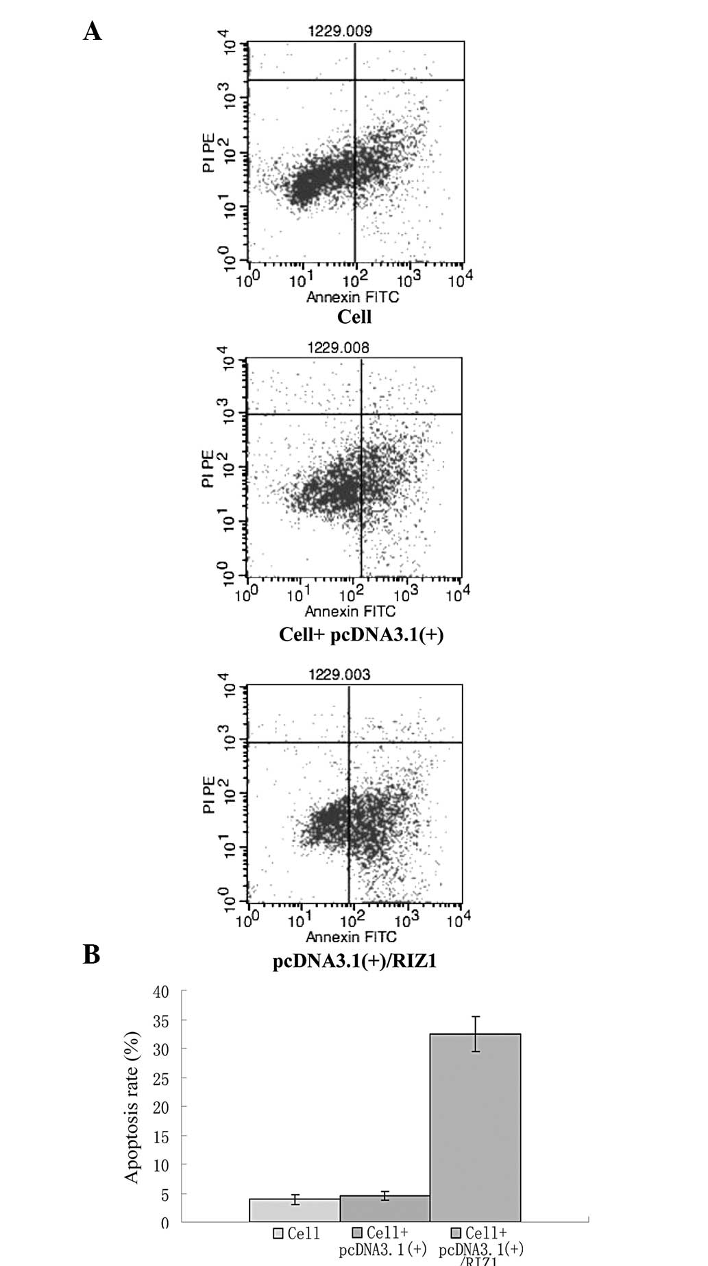 To determine the effect of overexpressing RIZ1 on apoptosis, 2×105 TE13 cells were seeded in six-well plates and allowed to attach for 12 h. Cell cycle synchronization was achieved by serum starvation in serum-free RPMI-1640 media for 24 h. The cells were subsequently transfected with pcDNA3.1(+)/RIZ1 and harvested after 24 h. The cells were fixed in 70% ice-cold ethanol overnight, treated with DNase-free Ribonuclease (Takara), stained with propidium iodide (Sigma-Aldrich, St. Louis, MO, USA) and subjected to analysis using a FACSAria™ (Becton-Dickinson, Franklin Lakes, NJ, USA). The data were analyzed using ModFit LT software (Verity Software House, Topsham, ME, USA). The TE13-untransfected and empty vector transfected cells were used as controls.