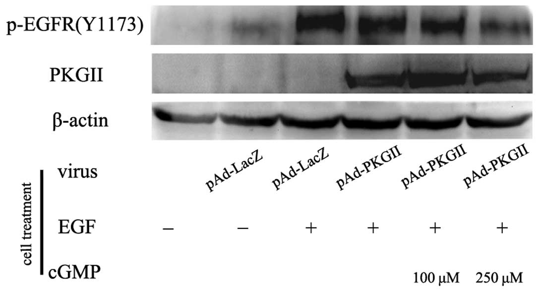 When EGF binds with EGFR, Tyr1173 is one of the autophosphorylation sites that is located on the receptor. The phosphorylation of this site is associated with PI3K/Akt-mediated signaling. In the present study, the inhibitory effect of PKG II on the Tyr1173 phosphorylation of EGFR was investigated in the differentially treated AGS cells, using western blotting. The results revealed that in the Ad-LacZ-infected cells, there was a marked increase in the phosphorylated Tyr1173 residues of EGFR when the cells were incubated with 100 ng/ml EGF for 5 min. In the cells that were infected with Ad-PKG II, stimulated with cGMP and incubated with 100 ng/ml EGF for 5 min, the phosphorylation was markedly decreased (Fig. 1). This indicated that PKG II was able to inhibit Tyr1173 phosphorylation/activation of EGFR caused by EGF.