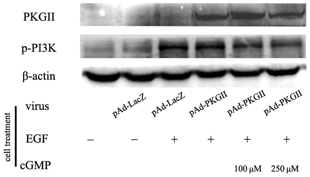 Phosphorylated EGFR is able to recruit the PI3K regulatory subunit, p85α, to its Tyr1173 site and activate the lipid kinase. During the activation processes, Tyr458 on p85α is phosphorylated. Western blotting with an antibody against p-PI3K p85 (Tyr458) was used to detect the phosphorylation of p85α. The AGS cells were treated as previously described and the western blotting results revealed that EGF treatment (100 ng/ml for 5 min) increased the phosphorylation of PI3K p85α. In the cells that were infected with Ad-PKG II, stimulated with cGMP and treated with EGF, the phosphorylation level of PI3K p85α was markedly lower than that of the cells that were infected with Ad-LacZ or treated with EGF alone (Fig. 2). These results revealed that PKG II inhibited the EGF-induced activation of PI3K.