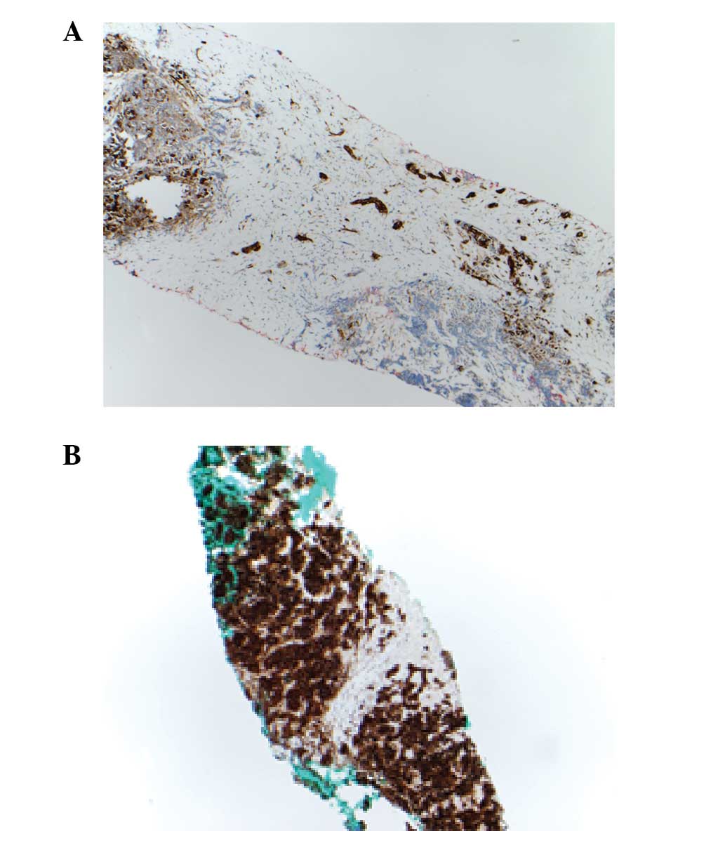 Formalin-fixed, paraffin-embedded (FFPE) tumor specimens were obtained from the Department of Pathology, Minneapolis VA Healthcare System. The archival FFPE slides stained with hematoxylin-eosin were reviewed by a pathologist (C.I.) to assess tumor volume and adequacy for immunostaining on both tissue biopsies and cytology cell-blocks. Sections (5-μm) were obtained from the corresponding FFPE blocks and stained using antibodies against neuronal Class B-tubulin (TUJ1) (1:400 dilution; monoclonal; cat. no. MMS-435P; Covance Inc., Princeton, NJ, USA) following the manufacturer’s instructions in a Leica Bond Max automated immunostainer (Leica Microsystems, Inc., Buffalo Grove, IL, USA). In brief, heat-induced epitope retrieval was performed with ethylenediaminetetraacetic acid-Tris base buffer (pH 8.9–9.1; Leica Microsystems, Inc.); primary antibody incubation time was 15 min, and a Bond polymer refined detection kit (Leica Bond; Leica Microsystems, Inc.) was used. Brain tissue was used as the positive control and muscle tissue was used as the negative control, as recommended in the antibody manual. Tumor staining was assessed by a trained pathologist (C.I.) with no knowledge of patient’s clinical data, under the light microscope at low- and high-power magnifications (×20–×200).