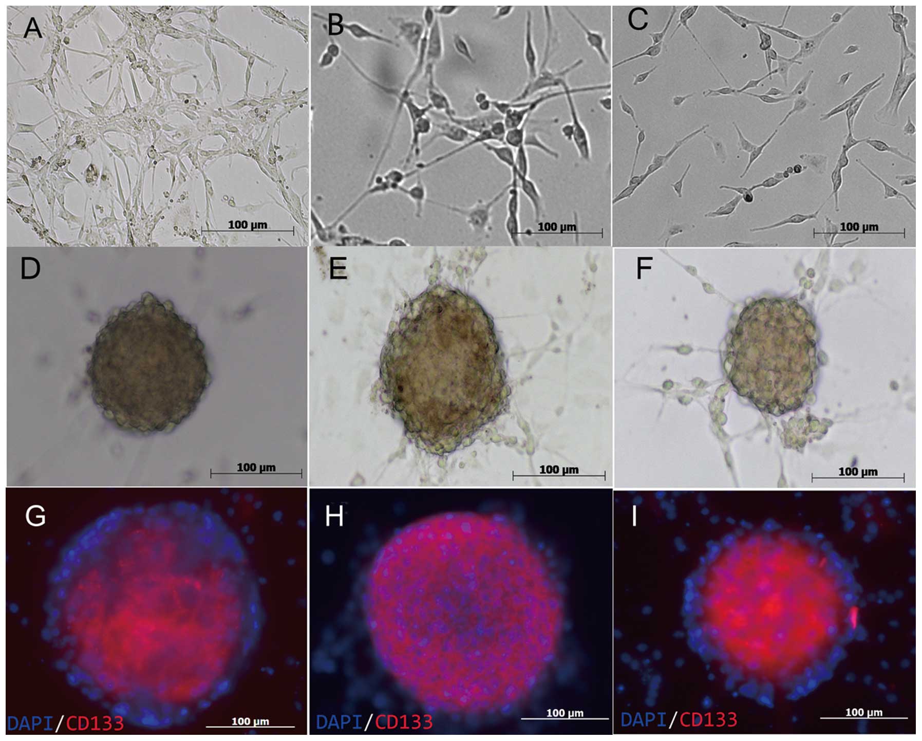 Conversely, GSC spheres grew rapidly in the serum-free medium. The present study, therefore, demonstrated that the majority of the cells, which were derived from MACS, expressed the neural stem cell biomarker CD133 (Fig. 3) (20,21) and were capable of cultivating GSC spheres.