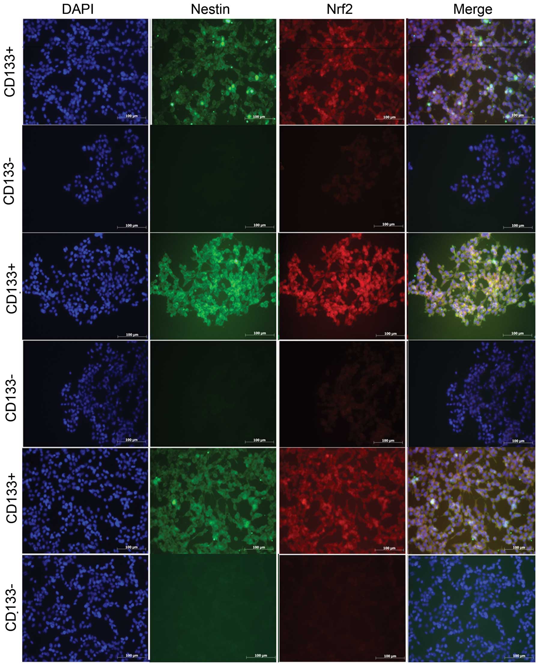 Nrf2 was significantly expressed in CD133+ GBM cells, regardless of which patient they were derived from. The CD133+ and CD133− cells from GBM were cultured in the same medium for ~4 h, which did not significantly influence the differentiation of GSCs.