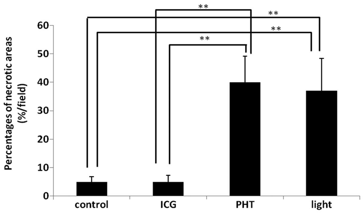 The present study used indocyanine green (ICG) and a broadband light source apparatus [photodynamic hyperthermal therapy (PHT) group] in order to treat a colon 26 tumor‑bearing mouse model. The other groups were administered either ICG alone (ICG group), light alone (light group) or no treatment (control group). Following the treatment, tumor growth was measured. Nine days after the treatment, the tumors were resected and histological and immunohistological examinations were performed. In the PHT group, the growth rates of the tumor tissues were significantly decreased compared with those observed in the other groups (P<0.05). The proportion of necrotic areas in the PHT and light groups were increased significantly compared with those observed in the ICG and control groups. However, there were no significant differences between the PHT and light groups. The proportion of Ki‑67 in the PHT and light groups was less than that observed in the ICG and control groups. The number of terminal deoxynucleotidyltransferase‑mediated dUTP nick end labeling‑positive cells in the PHT group was significantly increased compared with that observed in the other groups. These data indicate that PHT is effective in vivo and in vitro.