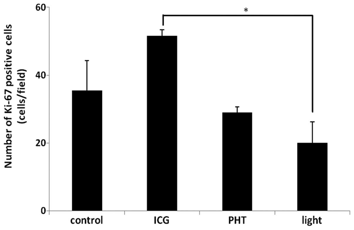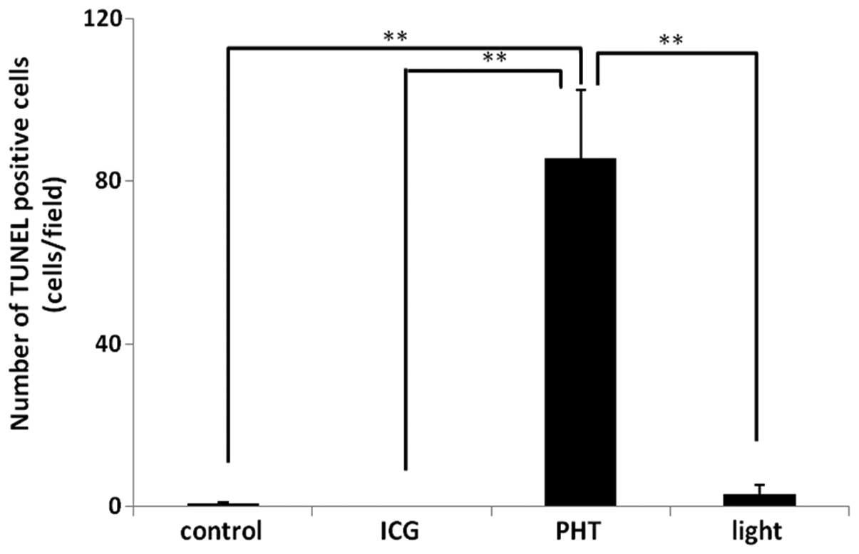 Radzi R, Osaki T, Tsuka T, Imagawa T, Minami S, Nakayama Y and Okamoto Y: Photodynamic hyperthermal therapy with indocyanine green (ICG) induces apoptosis and cell cycle arrest in B16F10 murine melanoma cells. J Vet Med Sci. 74:545–551. 2012. View Article : Google Scholar : PubMed/NCBI