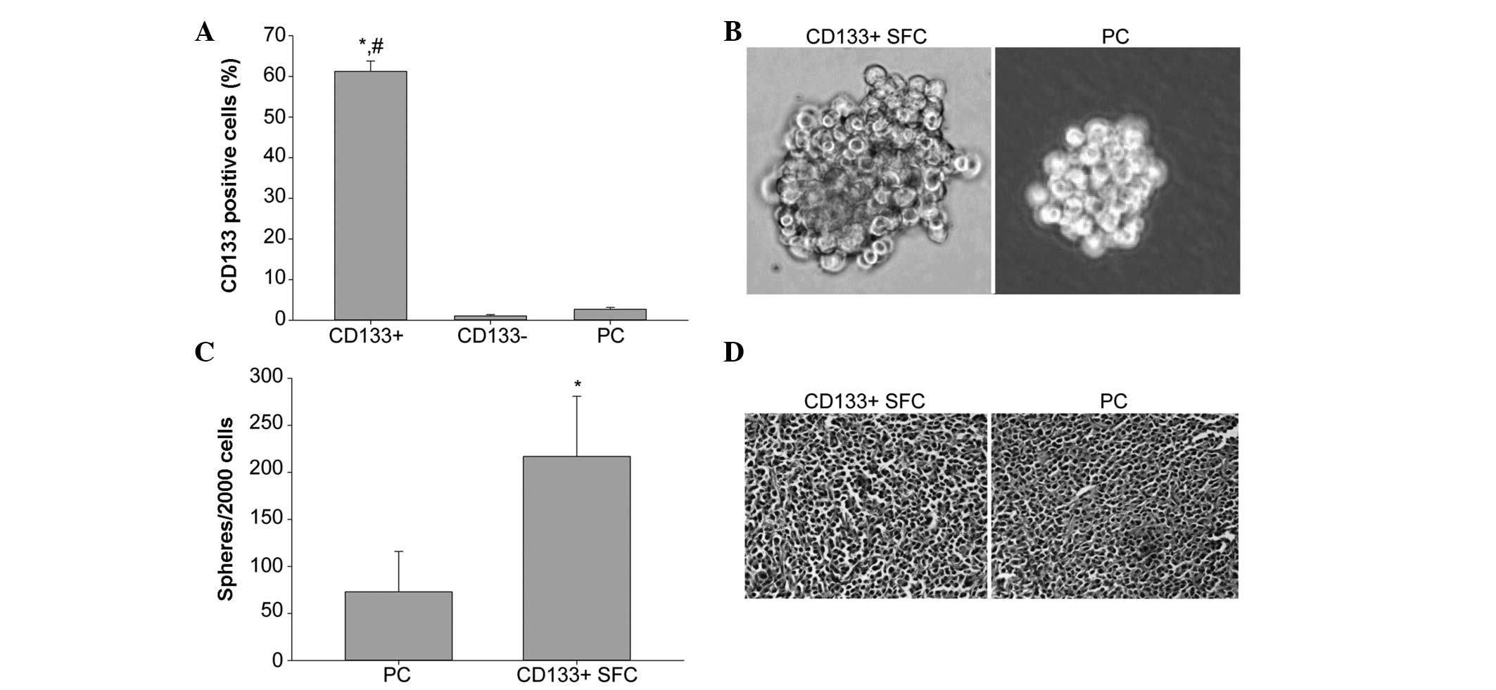 Pathogen-free male Balb/c-nu mice (age, 4–5 weeks) were purchased from the Animal Institute of the Chinese Academy of Medical Science (Beijing, China). All animal studies were performed in accordance with the standard protocols approved by the ethics committee of the Hunan Normal University (Changsha, China) and the committee of experimental animal feeding and management. Male Balb/c-nu mice (age, 4–5 weeks) were randomly divided into five groups (four mice per group) and maintained under standard conditions, according to the standard protocols. Cells were suspended in serum free-DMEM/Matrigel (BD Biosciences, Franklin Lakes, NJ, USA) mixture (1:1 volume). Each Balb/c-nu mouse was inoculated subcutaneously with different numbers of CD133+ SFCs (5×102, 1×103, 5×103, 1×104 and 5×104 cells) in one flank and parental cells (5×104, 1×105, 2×105, 5×105 and 1×106 cells) in the other, respectively. Tumorigenicity experiments were terminated 2 months after cell inoculation. Tumor size was measured with a caliper and the volume was calculated using the following: V (mm3) = L×W2×0.5; where L is the length and W is the width. Harvested tumors were examined and weighed immediately. Moreover, specimens from tumor tissue samples were fixed in 10% neutral-buffered formalin, processed in paraffin blocks and sectioned. The tissue sections were stained with hematoxylin and eosin and examined under light microscopy (IX-70, Olympus Corporation, Tokyo, Japan) for identification of the histopathological changes.