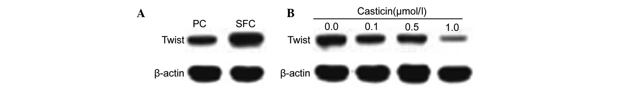 The transcription factor, Twist, was identified as the critical molecule of EMT (27,28). Based on our results that casticin inhibited EMT in LCSCs, we further investigated the effects of casticin on the expression of Twist. Twist was highly expressed in CD133+ SFCs (Fig. 3A). Western blot analysis indicated that the protein levels were downregulated following treatment with casticin (0.0, 0.1, 0.5 and 1.0 μmol/l) in CD133+ SFCs (Fig. 3B).