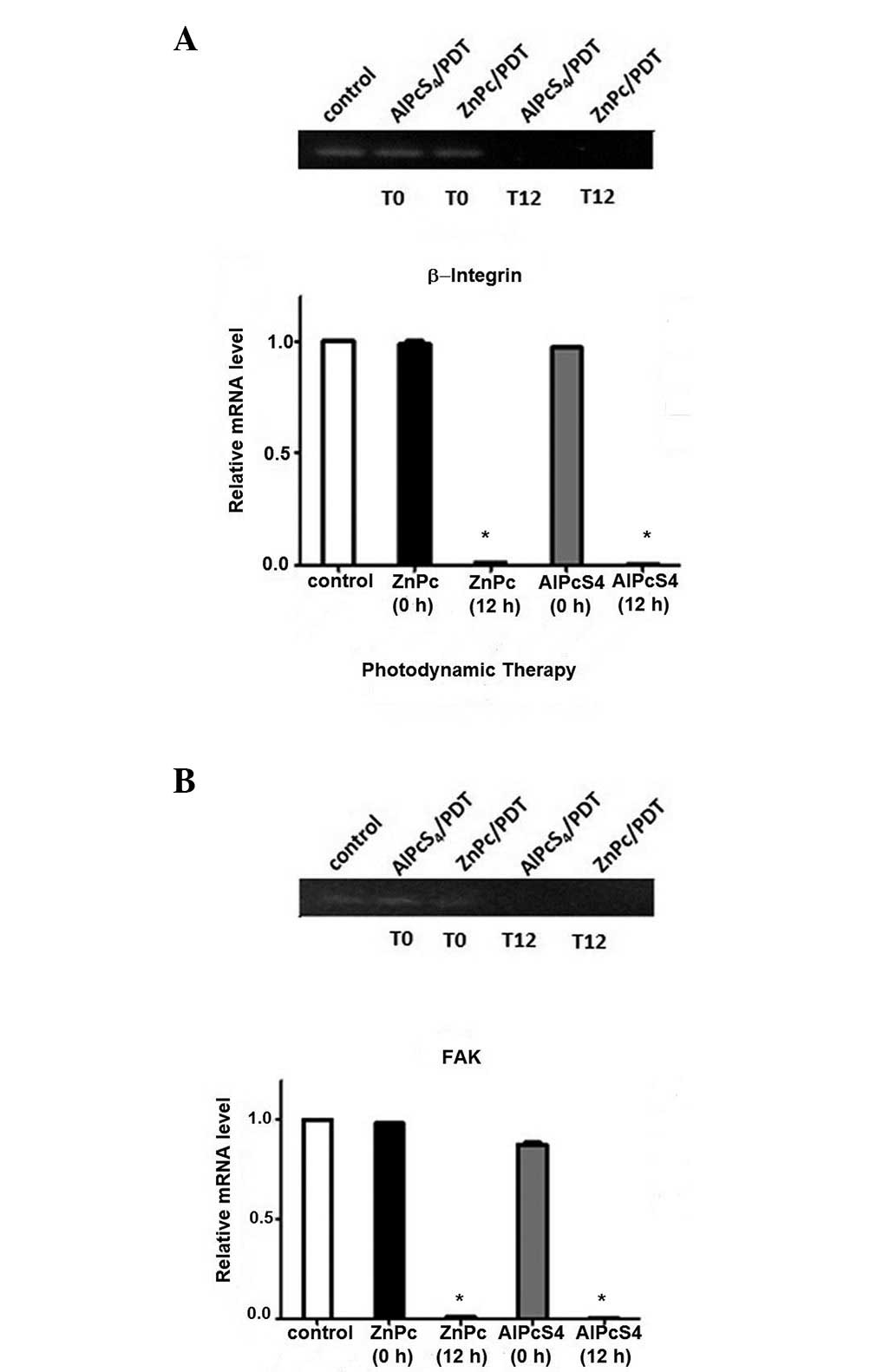 The present study describes the effect of photosensitizers ALPcS4 and ZnPc on cell adhesion. AlPcS4 was found to modify the structure of actin filaments, with more severe changes identified during the periods of 12, 24 and 48 h, as demonstrated by labeling with phalloidin-TRITC. In cultures treated with ZnPc/PDT, it was possible to observe the presence of small cytoplasmic projections, with concentrated actin filaments in the cell edge, demonstrating that cellular organization was affected by PDT treatment following 12 h, with a marginal recovery at 48 h. The cellular structure of actin is recognized as crucial to the maintenance of cell adhesion, and is therefore one of the targets of PDT (13,14); however, changes induced by PDT in the cytoskeletal proteins may be present in cells resistant to treatment, leading to changes in the adhesion and organization of the cytoskeletal components favoring the migration of these cells to other tissues. This alteration may be explained by the involvement of adhesion proteins, mainly β1-integrin and FAK, as these proteins are dependent on the disposition of the actin filaments. In the present study, the immunostaining of β1-integrin and FAK demonstrated a reduction in their protein expression 12 h following PDT. The RT-PCR results confirmed the reduction of the mRNA expression β1-integrin and FAK, 12 h following PDT for the two photosensitizers. These results were corroborated in the study by Milla Sanabria et al (6), which suggested that the adhesion of the cell to the substratum is mediated by integrins, and would therefore be interrupted following photodynamic action by damage to the ECM and by damage directly to the integrin proteins.