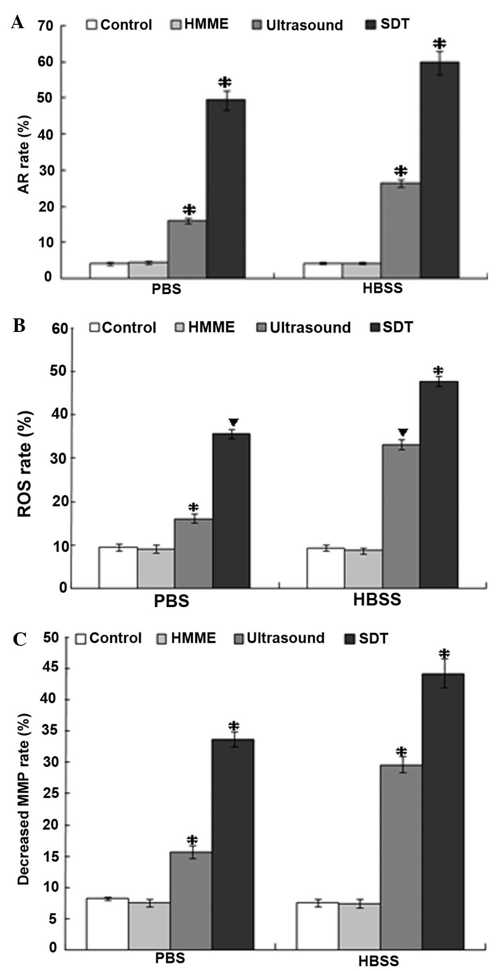 The apoptotic effect induced by SDT was dependent on ultrasound intensity, frequency, duration time and sonosensitizers, among others (9,21). Commonly, low-intensity ultrasound is a term describing intensities <3 W/cm2 (22,23), and ultrasound frequencies <1 MHz are usually used for drug delivery, blood-tumor barrier opening and ultrasonic therapy (22,24). Buldakov et al (24), Bai et al (25) and Jeong et al (26) observed antitumor effects in vitro and in vivo induced by SDT with ultrasound intensities of 0.3–2.6 W/cm2 and a frequency of 1 MHz. In addition, Zhai et al (27) and Ninomiya et al (28) showed an inhibitory effect on growth of cancer cells induced by SDT when changing the ultrasound parameters to a frequency of 0.5–1.5 MHz and intensities of 0.4–460 W/cm2 in vitro (27,28). The lower the frequency and intensity, the higher the cavitation effect and fewer side effects for the healthy surrounding tissue (8,19,20). Therefore, SDT in combination with HMME and the optimized ultrasound parameters of 1.0 W/cm2, 0.5 MHz and 60 sec were applied to the C6 glioma cells in the present study. The results revealed the occurrence of apoptosis by flow cytometry and transmission electron microscopy following SDT treatment. The apoptotic rate was significantly increased in the SDT-PBS (49.4±2.6%) group and further increased in the SDT-HBSS (59.9±3.2%) group following SDT, which was higher than that in previous studies whereby apoptotic rate was <40% in C6 glioma cells (3,6,9,18). Accordingly, the low-level ultrasound in combination with HMME may increase the apoptotic effect on C6 glioma cells.