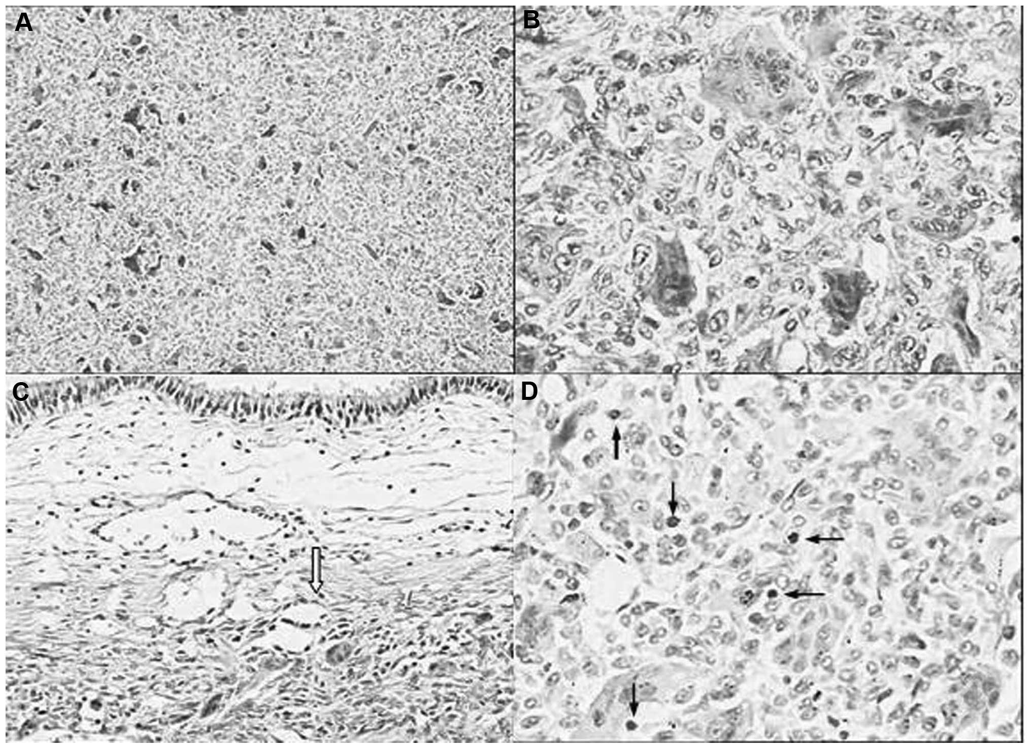 (A and B) Histopathological examination revealed that the tumor was composed of multinucleated giant cells and proliferative oval or spindle-shaped mononuclear stromal cells (stain, hematoxylin and eosin; magnification, A, ×40; B, ×200). (C) The tumor was locally aggressive infiltrating submucosal glands (stain, hematoxylin and eosin; magnification, ×100). (D) Numerous mitotic figures (arrows) in mononuclear stromal cells were observed; up to five per high-power field (stain, hematoxylin and eosin; magnification,x200).