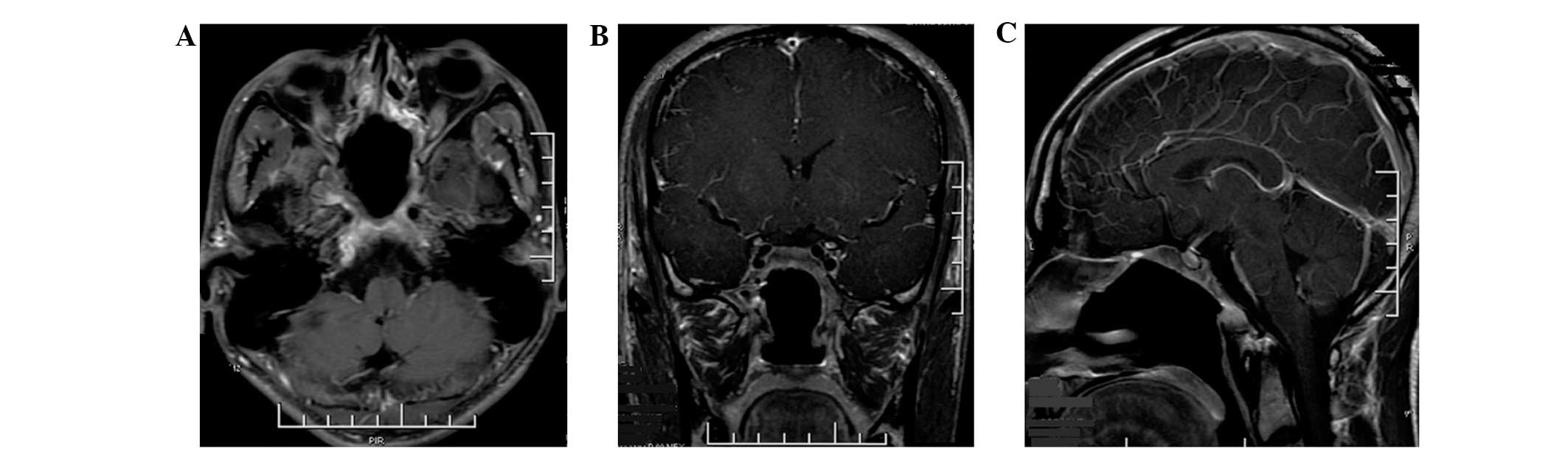 (A) Axial, (B) coronal and (C) sagittal section of postoperative T1-weighted magnetic resonance imaging with contrast revealing no residual or recurrent tumor.