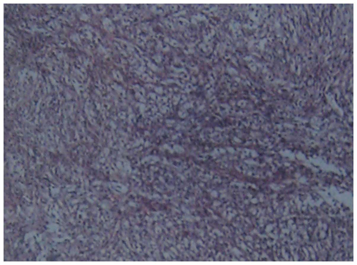 The prognosis of breast carcinosarcoma is poor (7). It exhibits different behavior compared with carcinoma or sarcoma of the breast and is associated with a worse prognosis than classical breast carcinoma (8). The overall five-year survival rate is only 49% (9). Clinicopathological parameters, including tumor size, differentiation rate, a high histological grade, atypia and active pleomorphic spindle cells are important in prognosis (10). However, no significant difference was identified when breast carcinosarcoma was compared with high-grade receptor-negative infiltrative carcinomas (11). Hennessy et al (12) examined 100 patients that presented with biphasic metaplastic sarcomatoid carcinoma and 98 patients that exhibited carcinosarcoma, which were identified using the Surveillance, Epidemiology, and End Results database. The five-year overall survival rates at stages I, II, III, and IV were identified to be 0.73, 0.59, 0.44 and 0.00, respectively. The patient in the present study survived for only five months following the occurrence of lumbago.